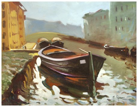 MARIO ROSATI Navicelli Olio su faesite 30 x 40. Firma in b. a d.; sul verso titolo, firma e località.