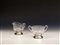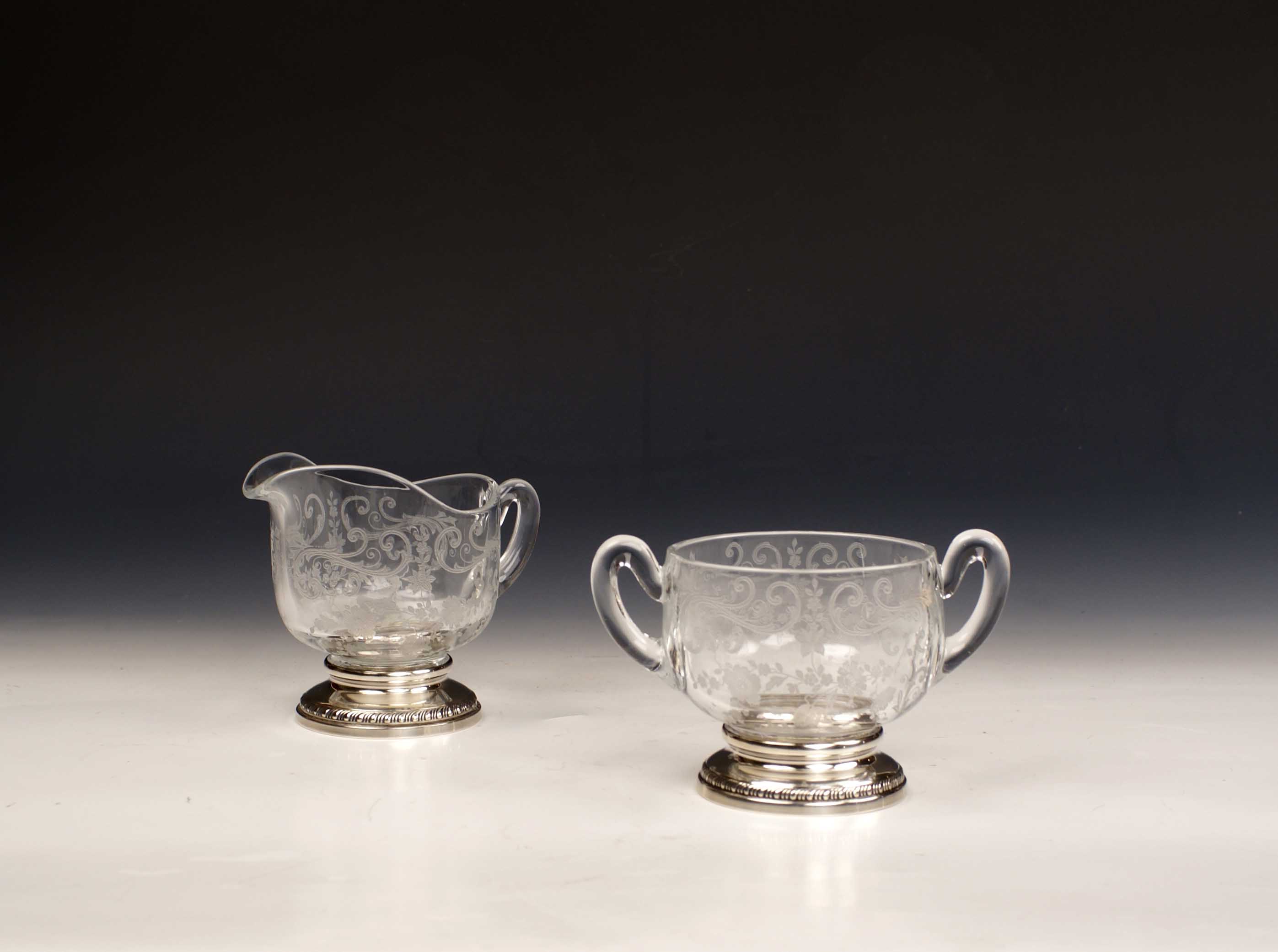 LATTIERA E ZUCCHERIERA IN VETRO INCISO Stati Uniti vecchia manifattura Poggianti su basi circolari in argento