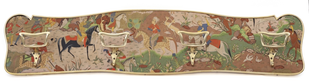 Pannello di legno lievemente imbottito rivestito in tessuto di seta stampato con scene orientali di caccia ottone.