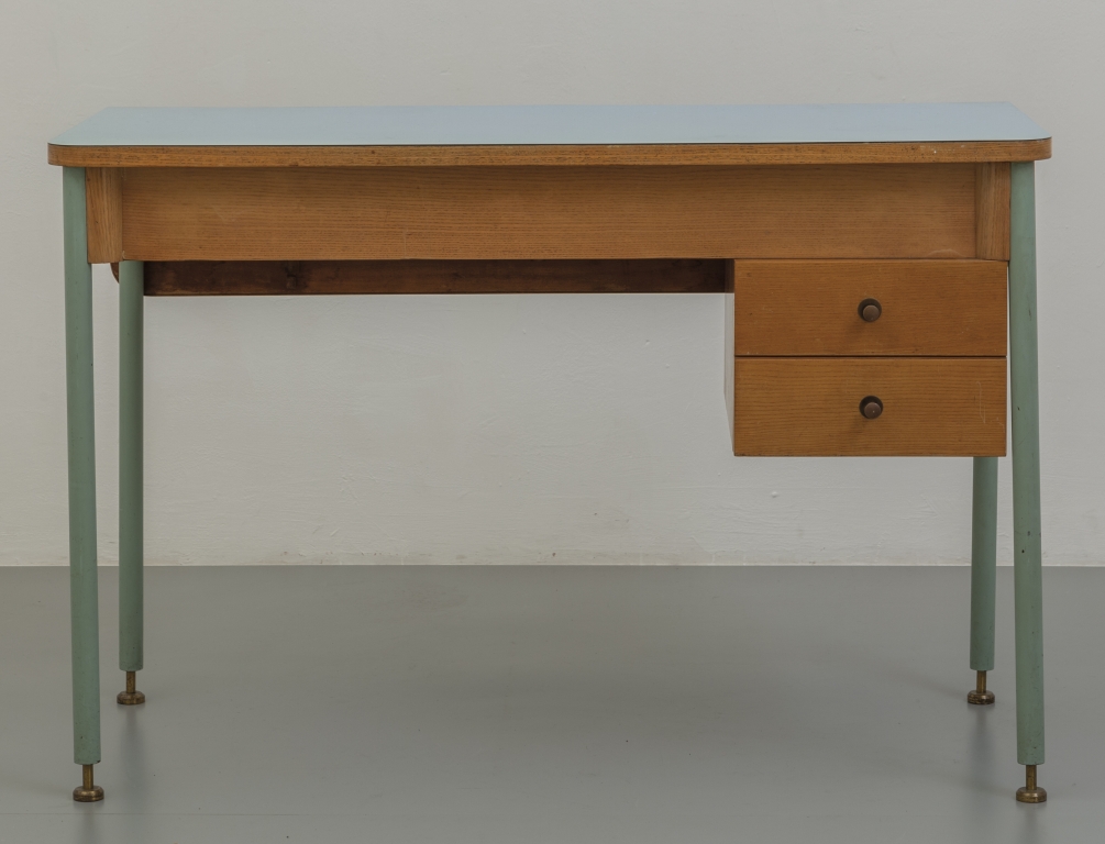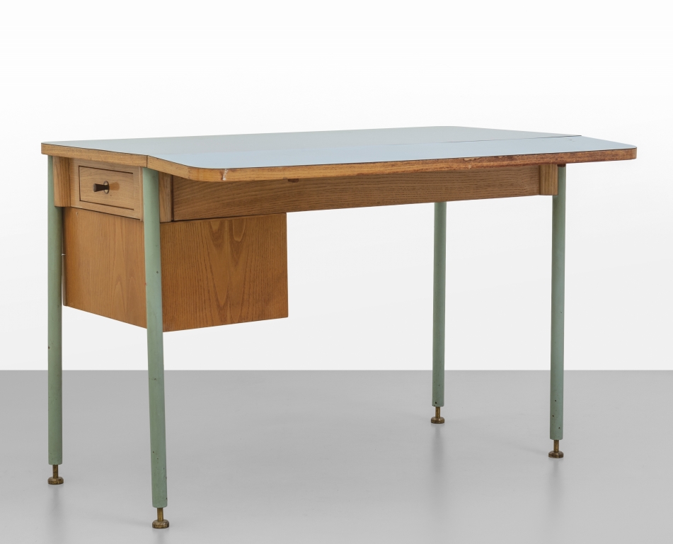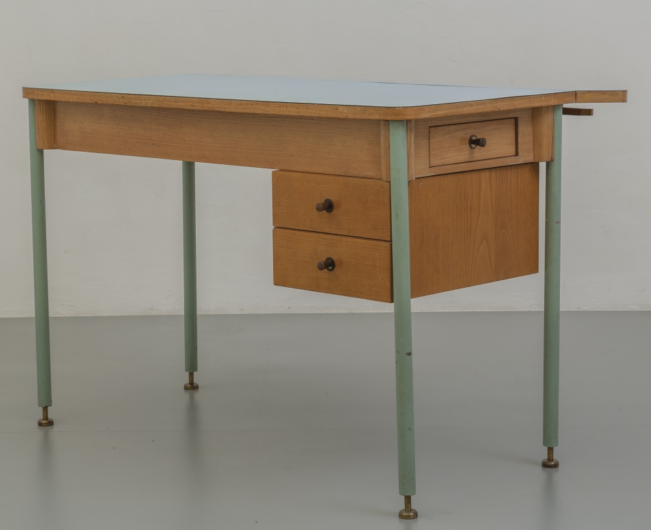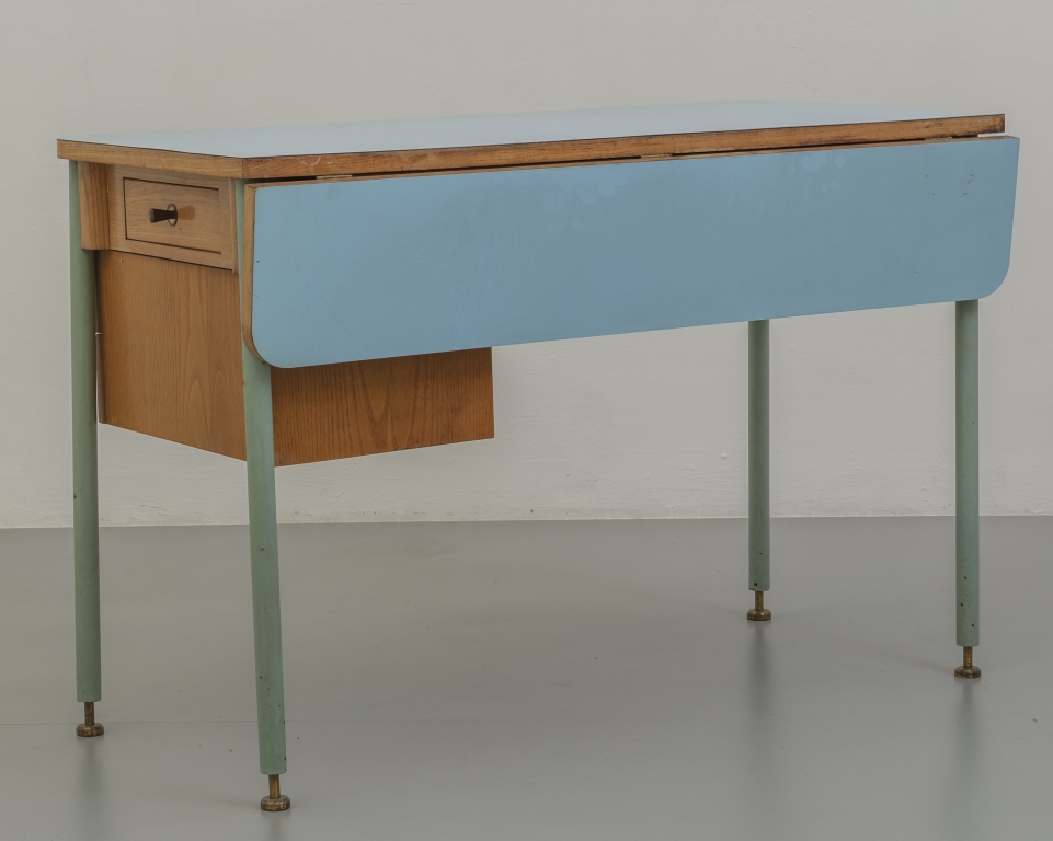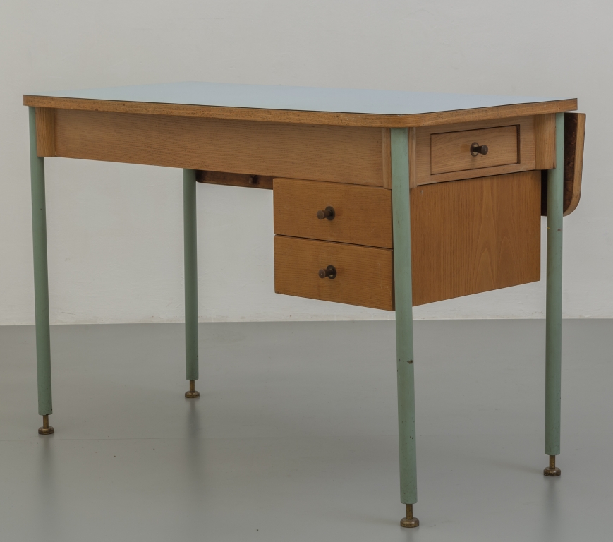 Acciaio tubolare verniciato ottone piedini regolabili legno di frassino legno impiallacciato in frassino formica piano parzialmente ribaltabile.