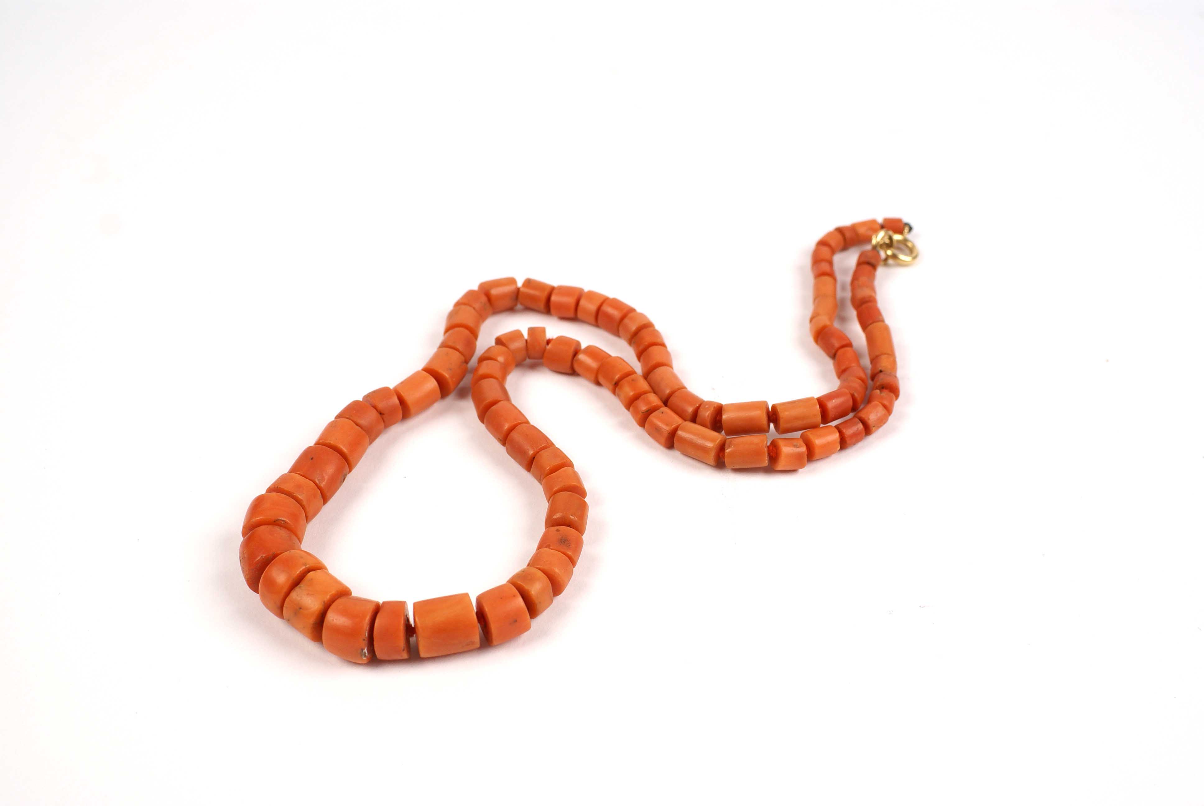 LUNGA COLLANA IN CORALLO E ORO Composta da un filo di coralli color salmone disposti a gradazione, chiusura a moschettone in oro giallo 18kt Peso 60 gr.