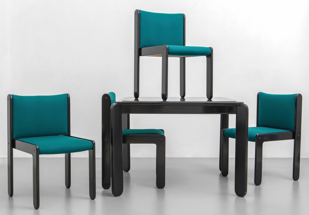 Un tavolo da pranzo o da gioco e quattro sedie anni '70.