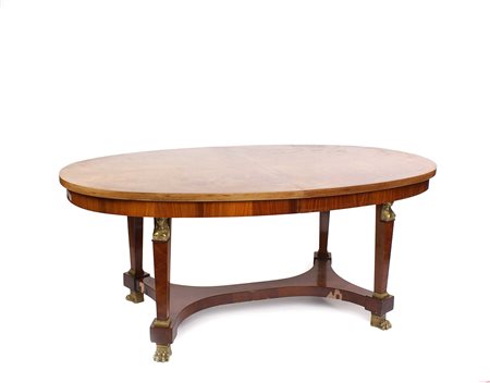 TAVOLO IMPERO IN MOGANO E PIUMA DI MOGANO Francia, XIX Sec. Piano ovale poggiante su quattro sostegni troncopiramidali con applicazioni in bronzo dorato e riuniti da traversa centrale, terminali ferini in bronzo dorato (mancanze) Dim. 76x180x110 cm.