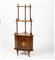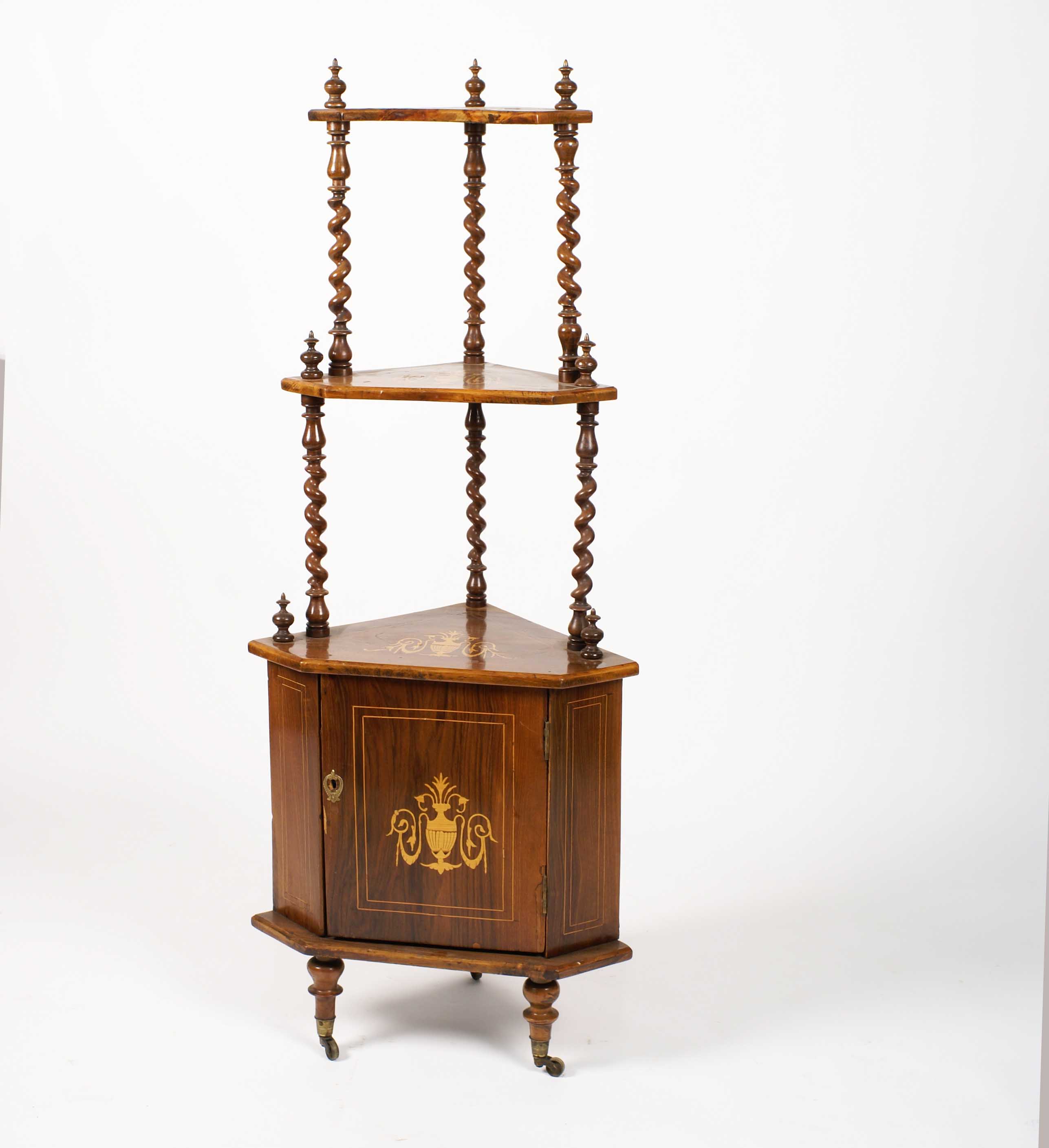 ANGOLIERA IN NOCE XIX Sec. Intarsiata e filettata in legno di bosso, a tre ripiani sostenuti da colonnine tornite con uno sportello sottostante, piedini provvisti di rotelle Dim. 136x40x40 cm.