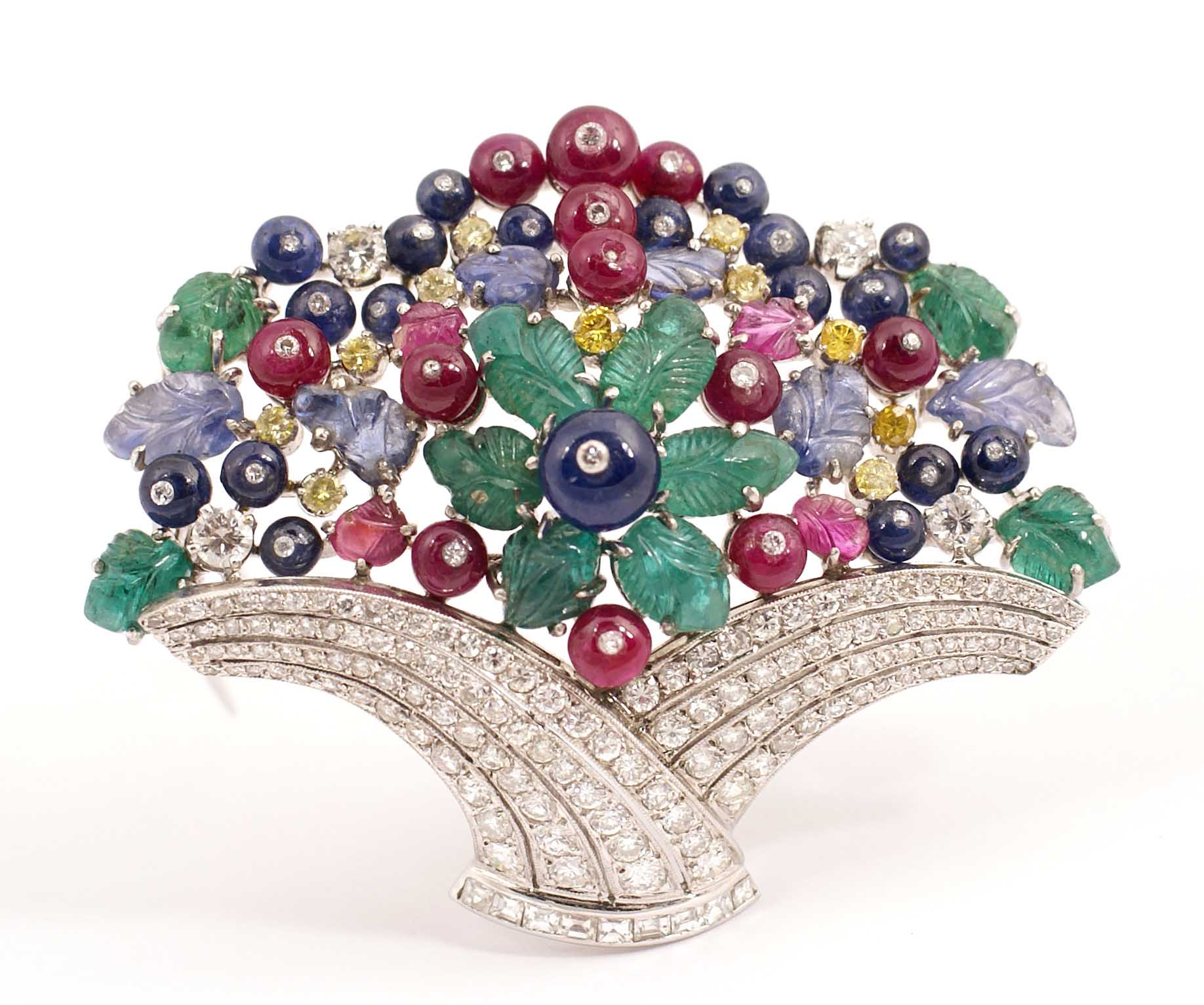 SPILLA "TUTTI FRUTTI" IN ORO BIANCO 18KT Con diamanti taglio brillante per carati 2,50 circa, zaffiri gialli, rubini, smeraldi e zaffiri di vario taglio Peso 37,8 gr.