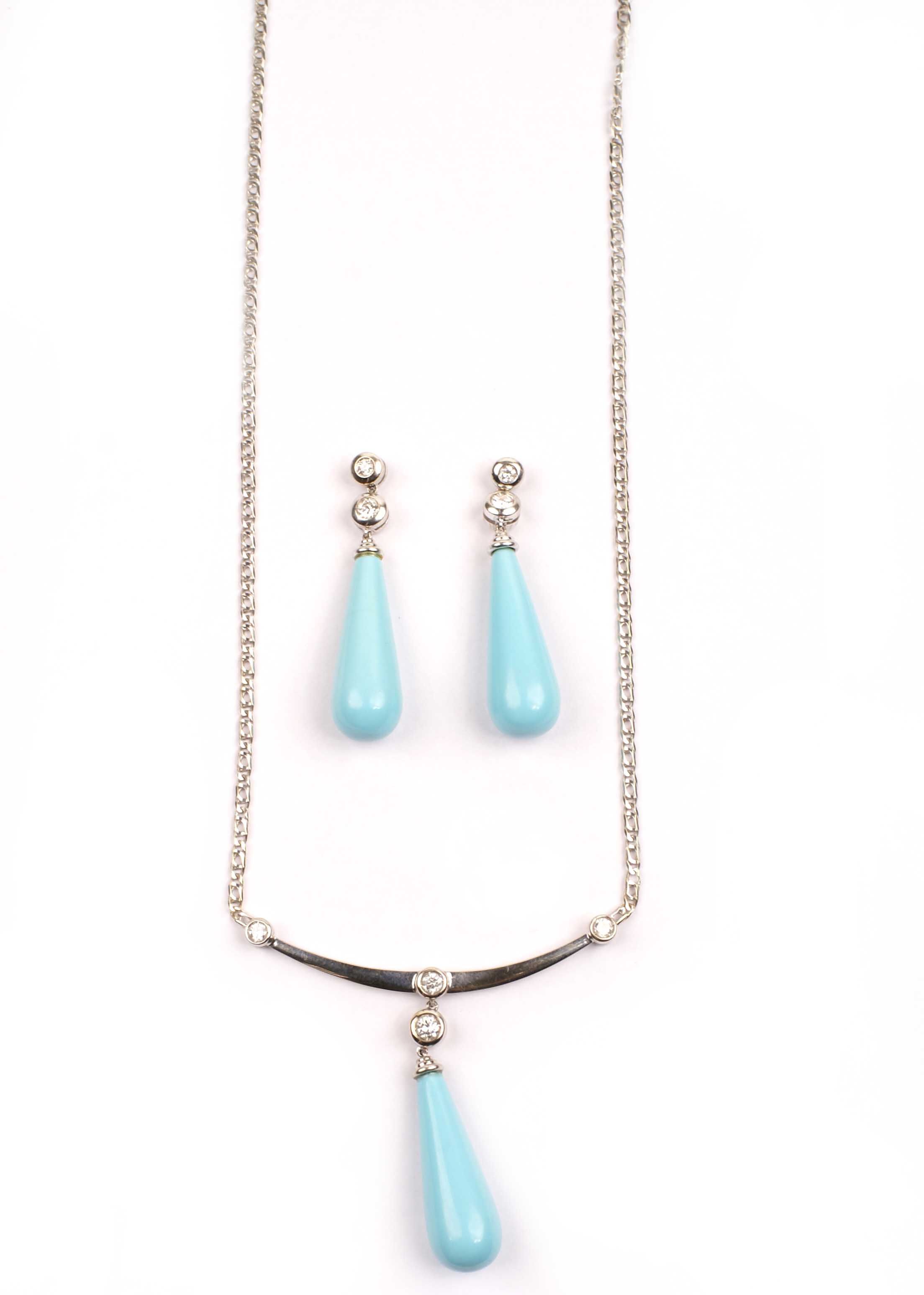 PARURE IN ORO BIANCO 18KT CON TURCHESI NATURALI Composta da un girocollo e un paio di orecchini con diamanti taglio brillante per 0,60 punti circa Peso 17,7 gr.