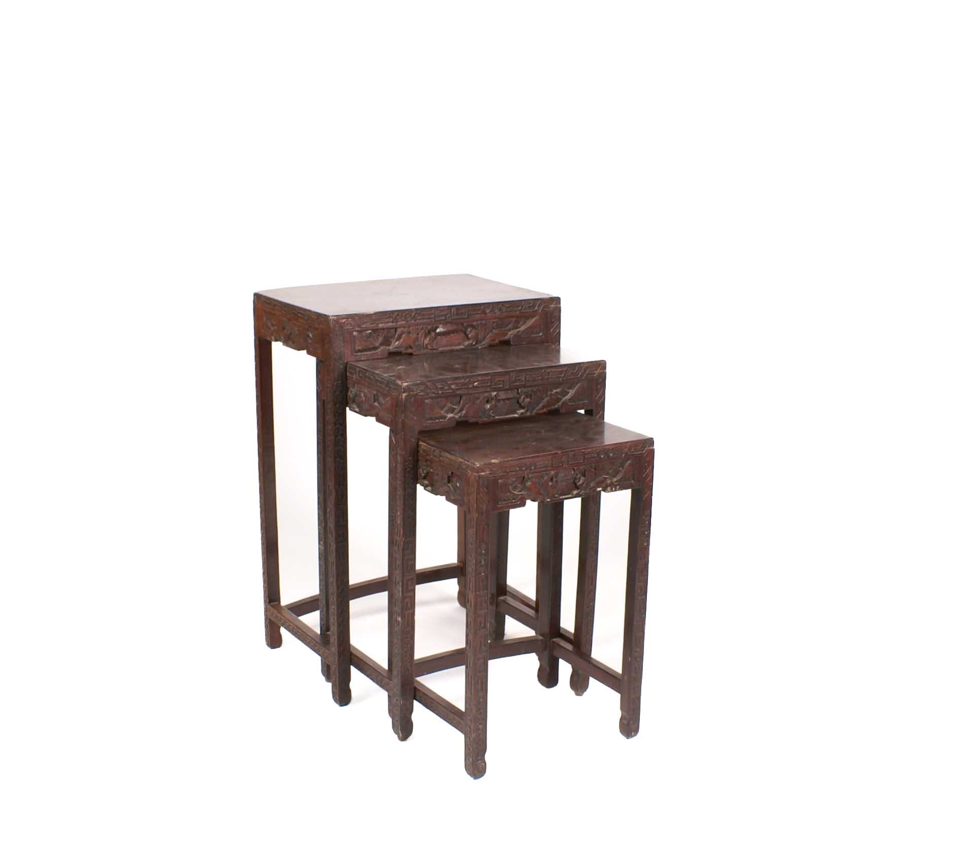 TAVOLINO A NIDO Cina vecchia manifattura In legno intagliato a motivi di chinoiserie, (difetti e mancanze) Dim. 68x46x35 cm.