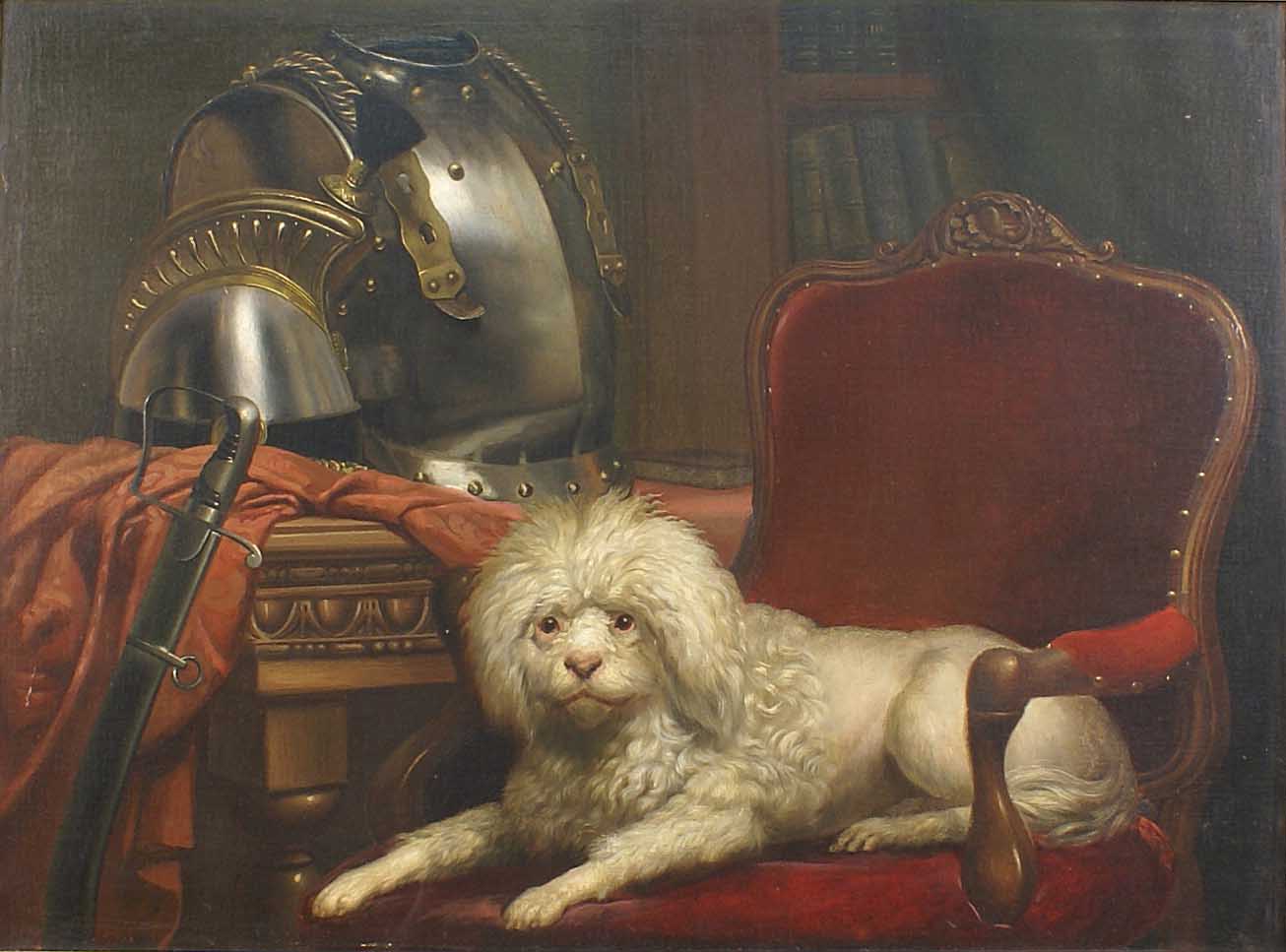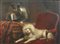 SCUOLA FRANCESE XIX Sec. "Interno con cane ed armatura", olio su tela, entro...