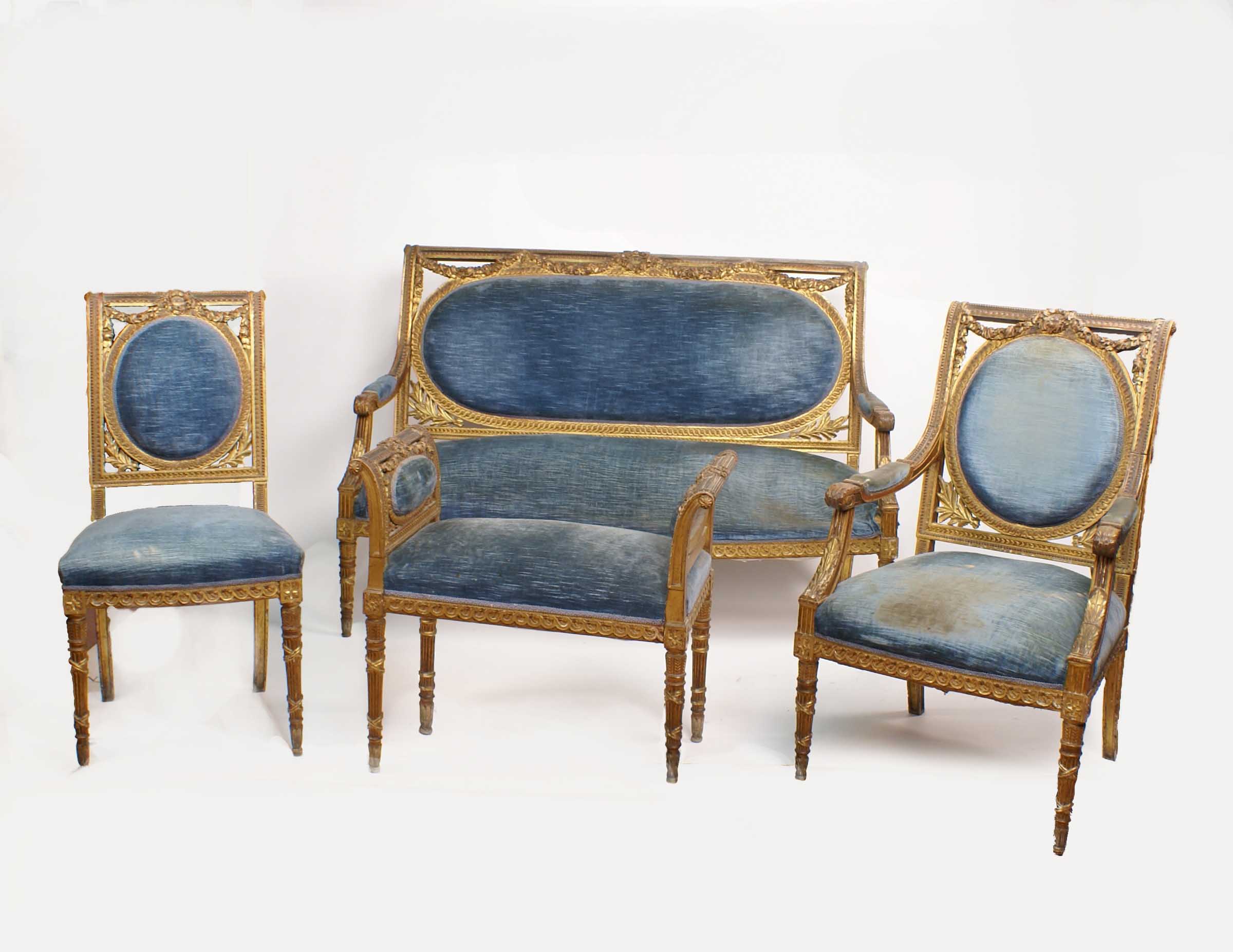 SALOTTO IN LEGNO DORATO Francia fine del XIX Sec. Intagliato e decorato a motivi di ghirlande di fiori, composto da un divano, due poltrone, quattro sedie e una panchetta, sedute e schienali imbottiti e rivestiti in tessuto e poggianti su gambe anteriori scanalate e gambe posteriori a sciabola (difetti e mancanze)