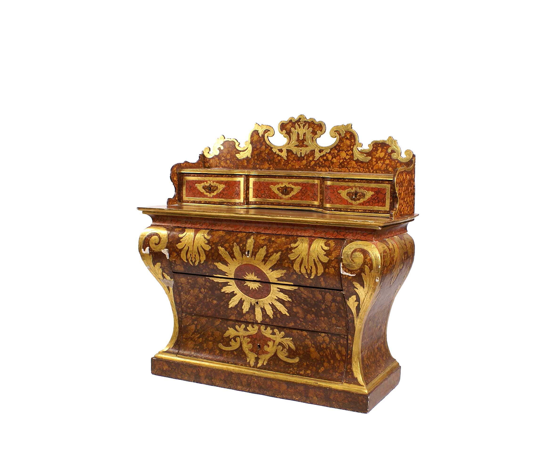 PARTICOLARE CASSETTONE Sicilia, XVIII Sec. Con alzata e tiretti vari in legno laccato e parzialmente dorato, linea mossa, fronte a tre cassetti Dim. 150x140x62 cm.