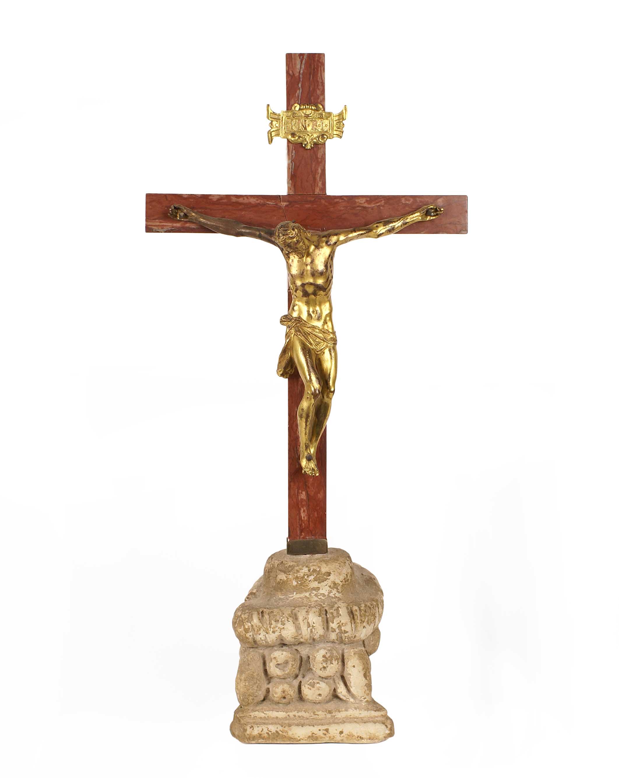 GUGLIELMO DELLA PORTA, SCUOLA DEL Porlezza 1515 - Roma 1577 Cristo sulla croce, figura in bronzo dorato montata su marmo rosso, base in travertino (difetti sul marmo e sulla scritta INRI) H. 54 cm.