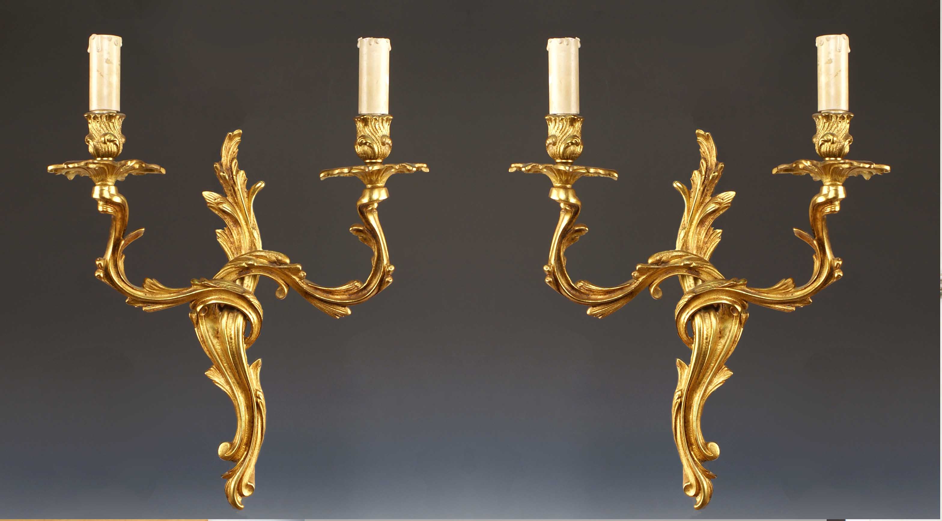 COPPIA DI APPLIQUES A DUE LUCI vecchia manifattura In bronzo dorato e cesellato a motivi di volute