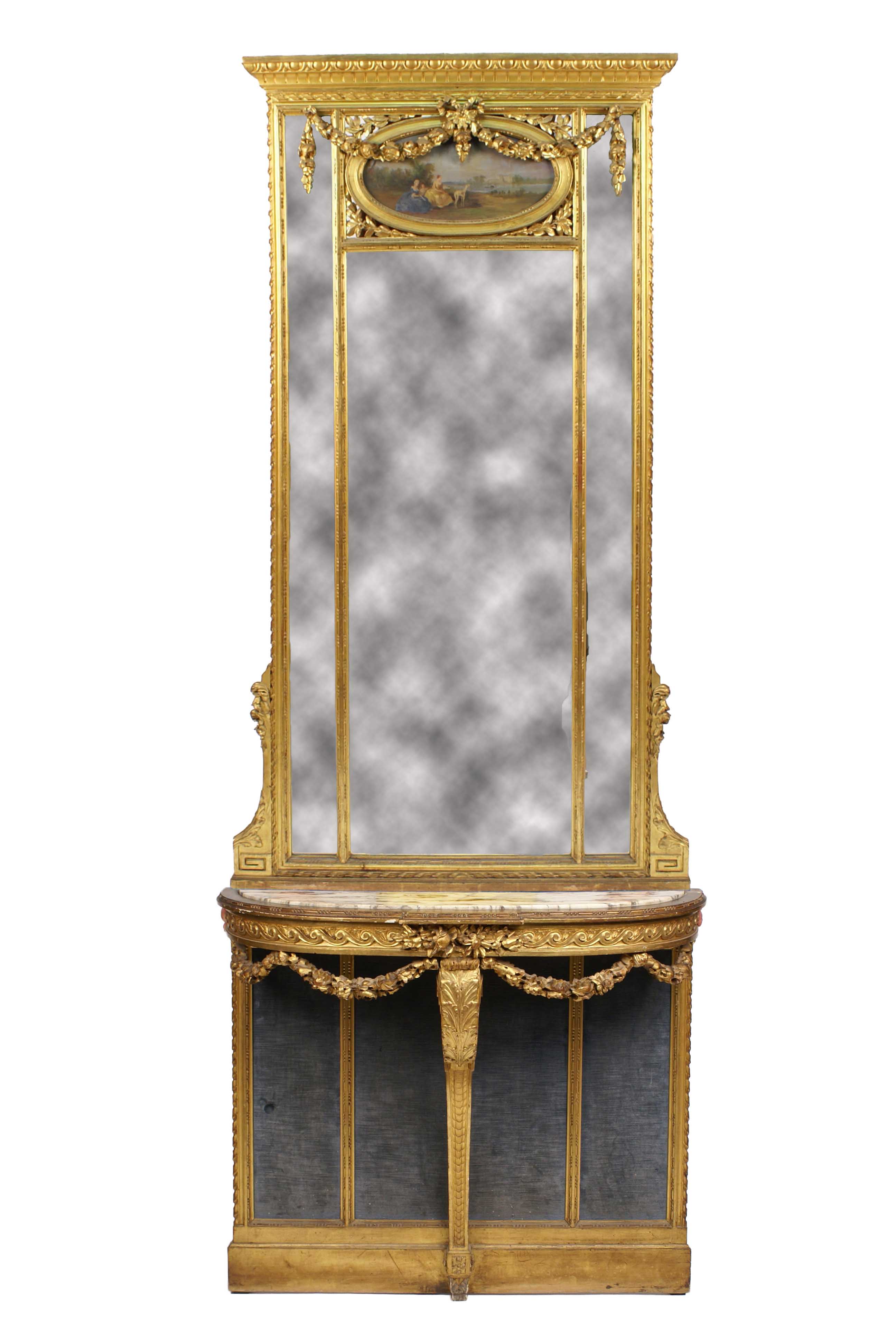 CONSOLE CON RELATIVA SPECCHIERA Francia fine del XIX Sec. In legno dorato ed intagliato a motivi di volute e ghirlande di fiori; specchiera rettangolare con cimasa centrata da un dipinto olio su tavola raffigurante un paesaggio con figure, console con piano a mezzaluna in marmo fior di pesco parzialmente rivestita in tessuto (difetti e mancanze) Dim. 276x106x43,5 cm.