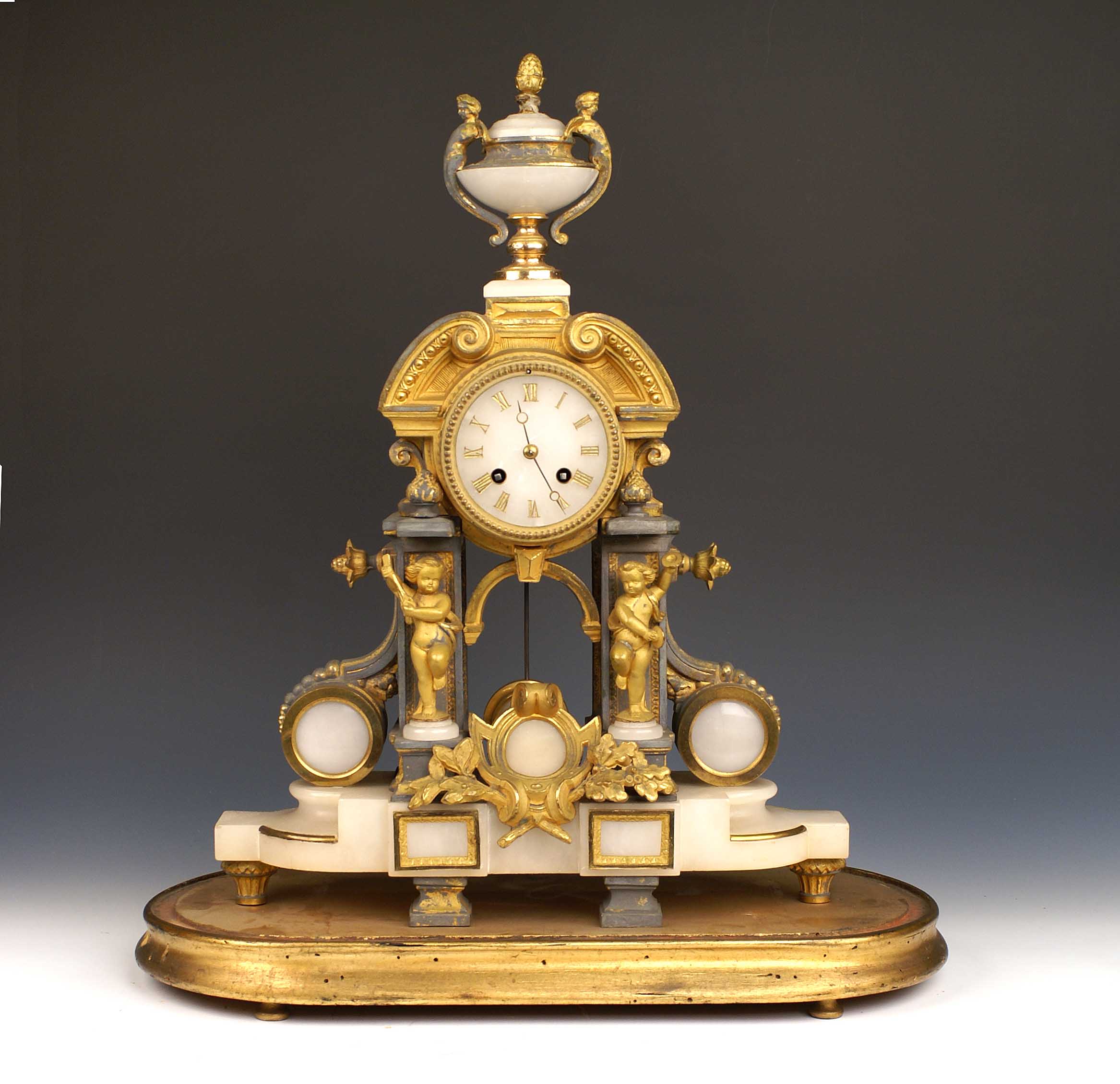 PENDOLA IN BRONZO DORATO E ALABASTRO Francia fine del XIX Sec. Quadrante circolare con numeri romani su struttura architettonica cesellata e decorata da due putti allegorici, base sagomata in legno dorato con relativa campana in vetro soffiato (difetti) Dim. 70x47x24 cm.