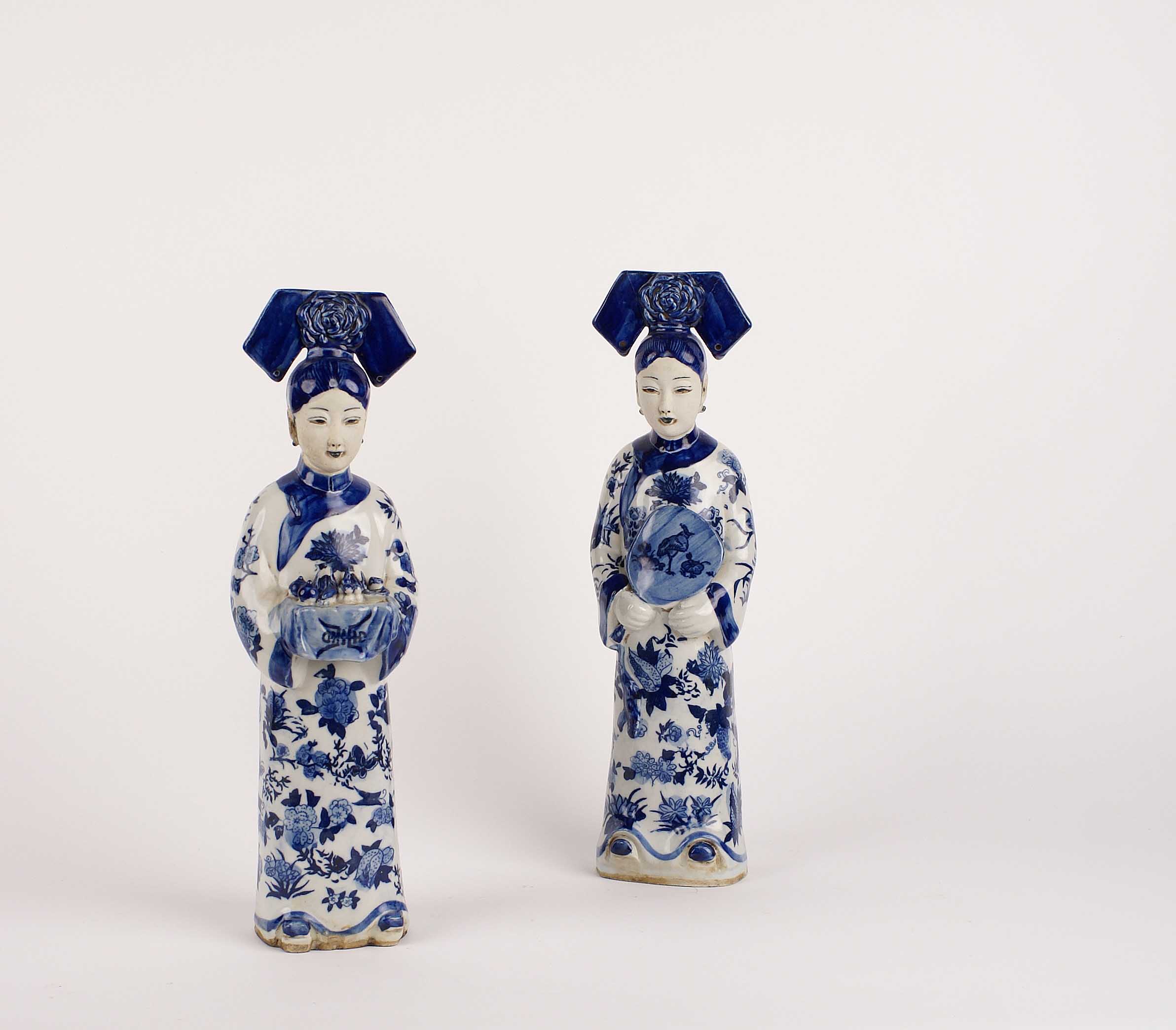 COPPIA DI FIGURE FEMMINILI Cina In porcellana bianca e blu H. 32 cm.