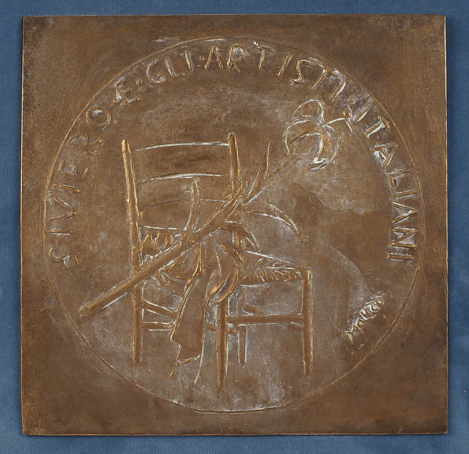 GIACOMO MANZù Bergamo 1908 - Roma 1991 "Sedia con drappo e giglio", medaglione a bassorilievo in bronzo, firmato in basso a destra con iscrizione "Siviero e gli artisti italiani" Dim. 23x23 cm.