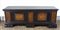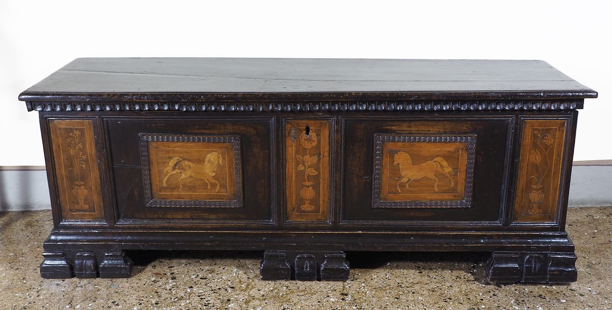 Cassapanca in legno intarsiata in legni chiari con figure di uccelli. XVII...