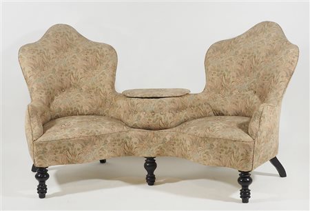 Divano tete-a-tete in legno rivestito da stoffa floreale, al centro uno scomparto. XIX secolo. Lung. cm. 170.
