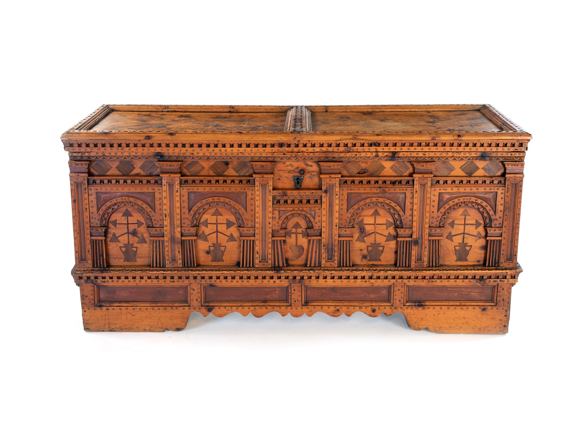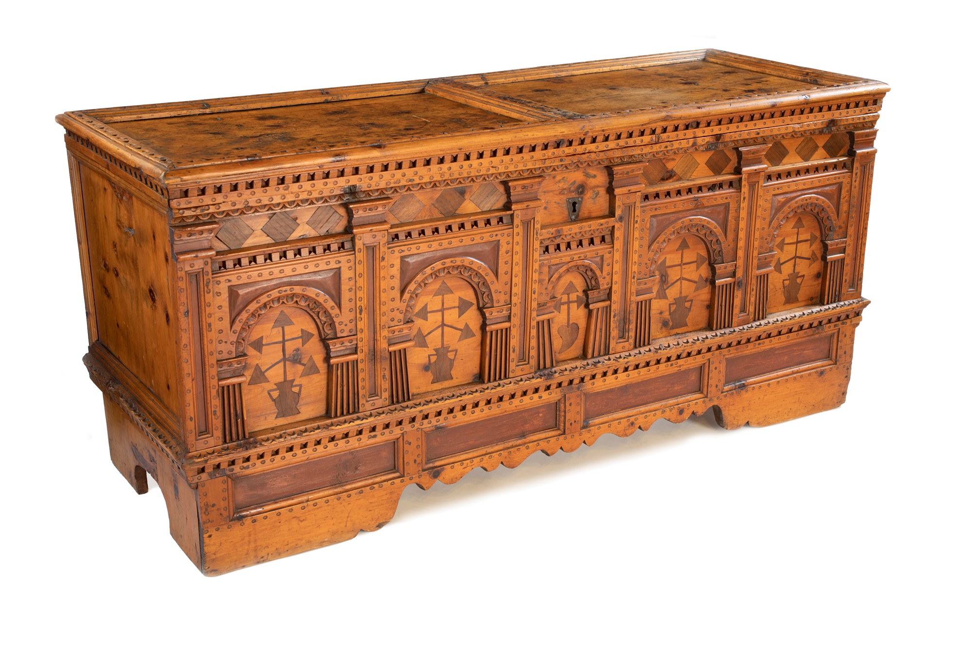 con facciata di impostazione architettonica scandita da archi in sequenza delimitati da lesene, ornati da intarsi a motivi stilizzati; piedi a mensola. XVIII secolo. cm 81x174x62
