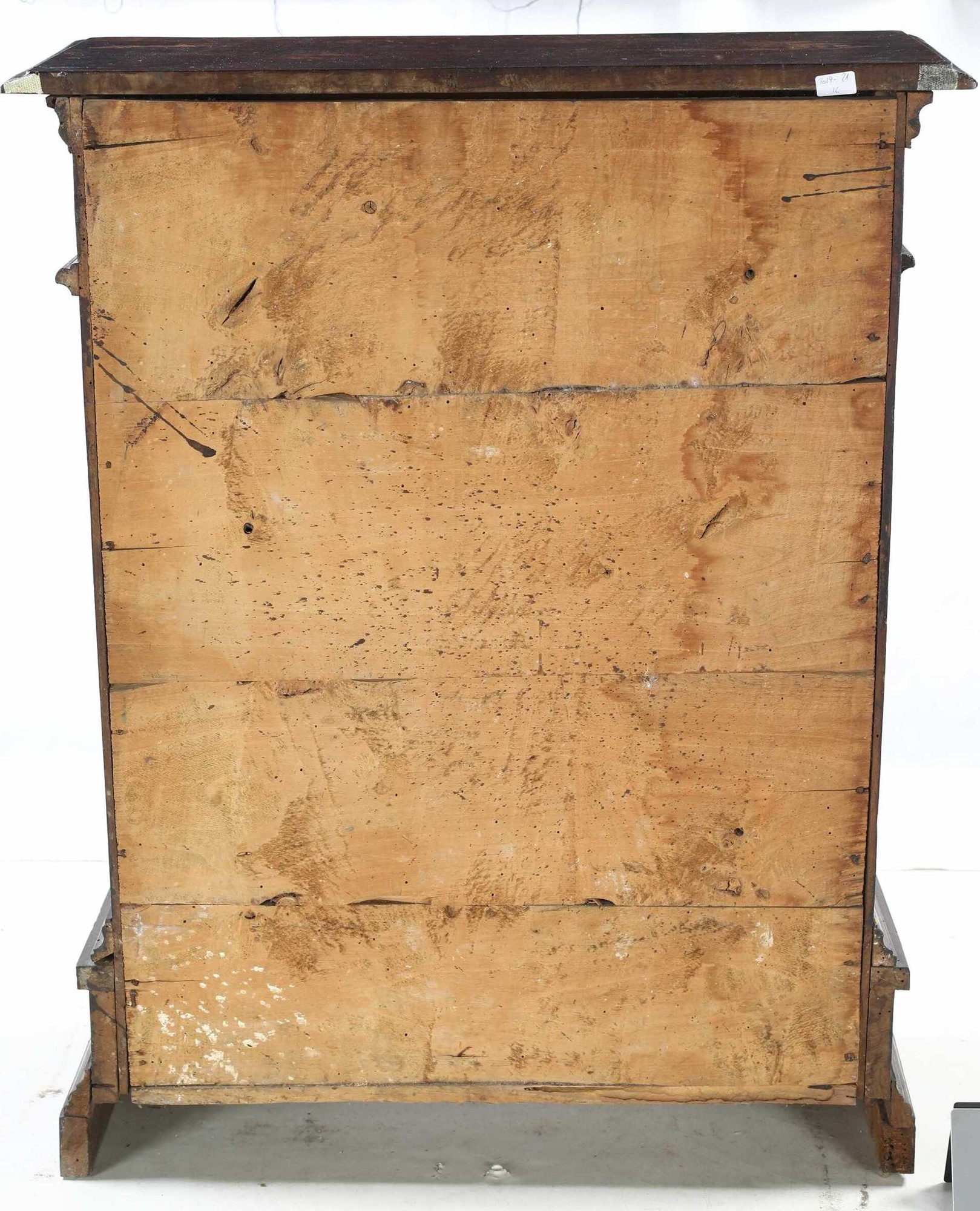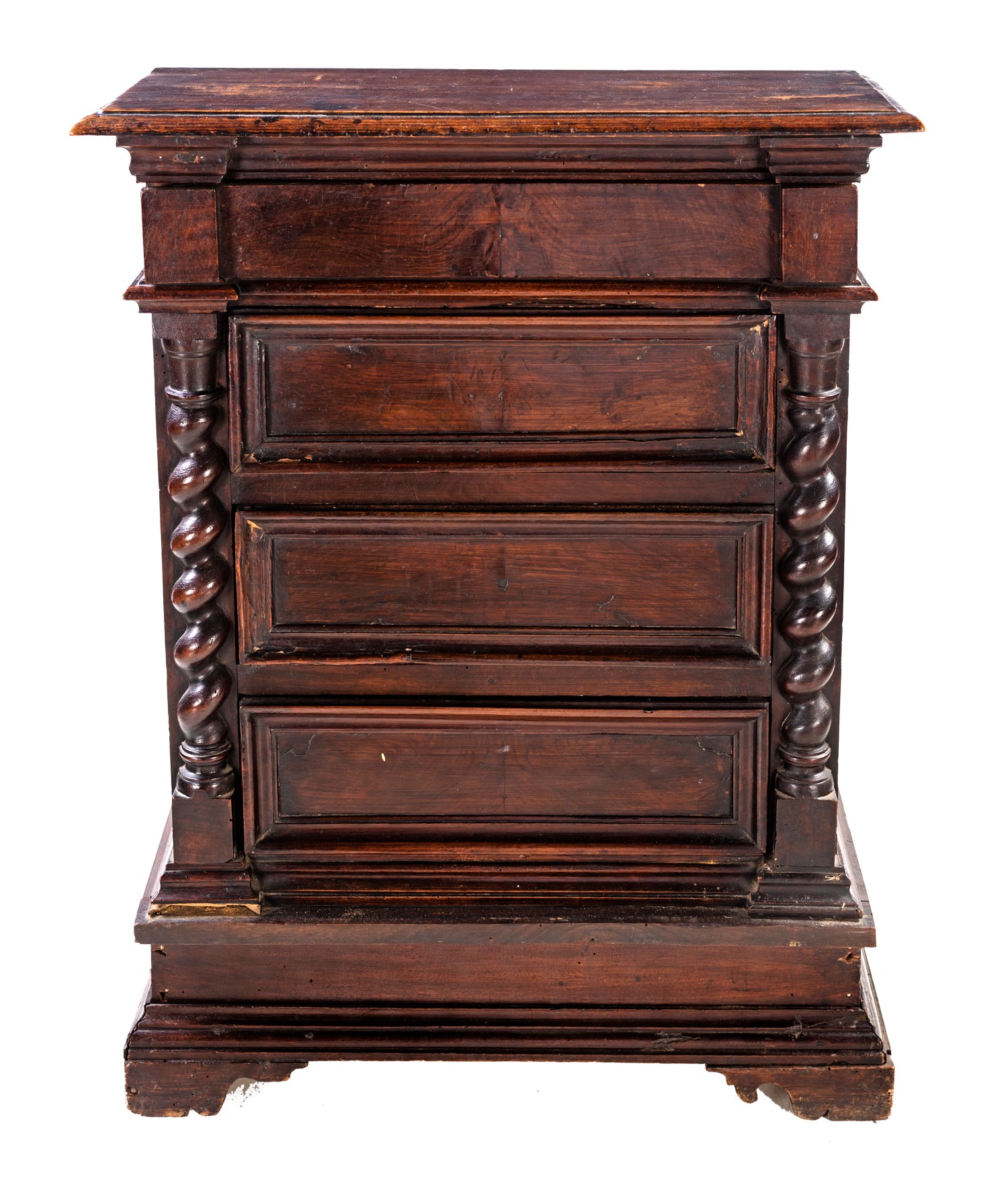 in noce, con tre cassetti riquadrati da cornici modanate, delimitati da lesene tornite; piedi a mensola. XVII secolo. Difetti. cm 86x68x28