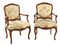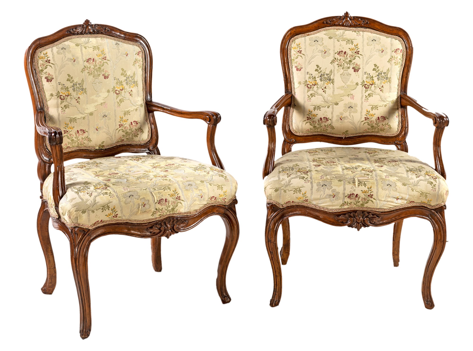 con cornici sagomate percorse da nervature, centrate da rilievi vegetali intagliati; schienali e sedili imbottiti, gambe mosse. Meta del XVIII secolo. cm 93x62x50