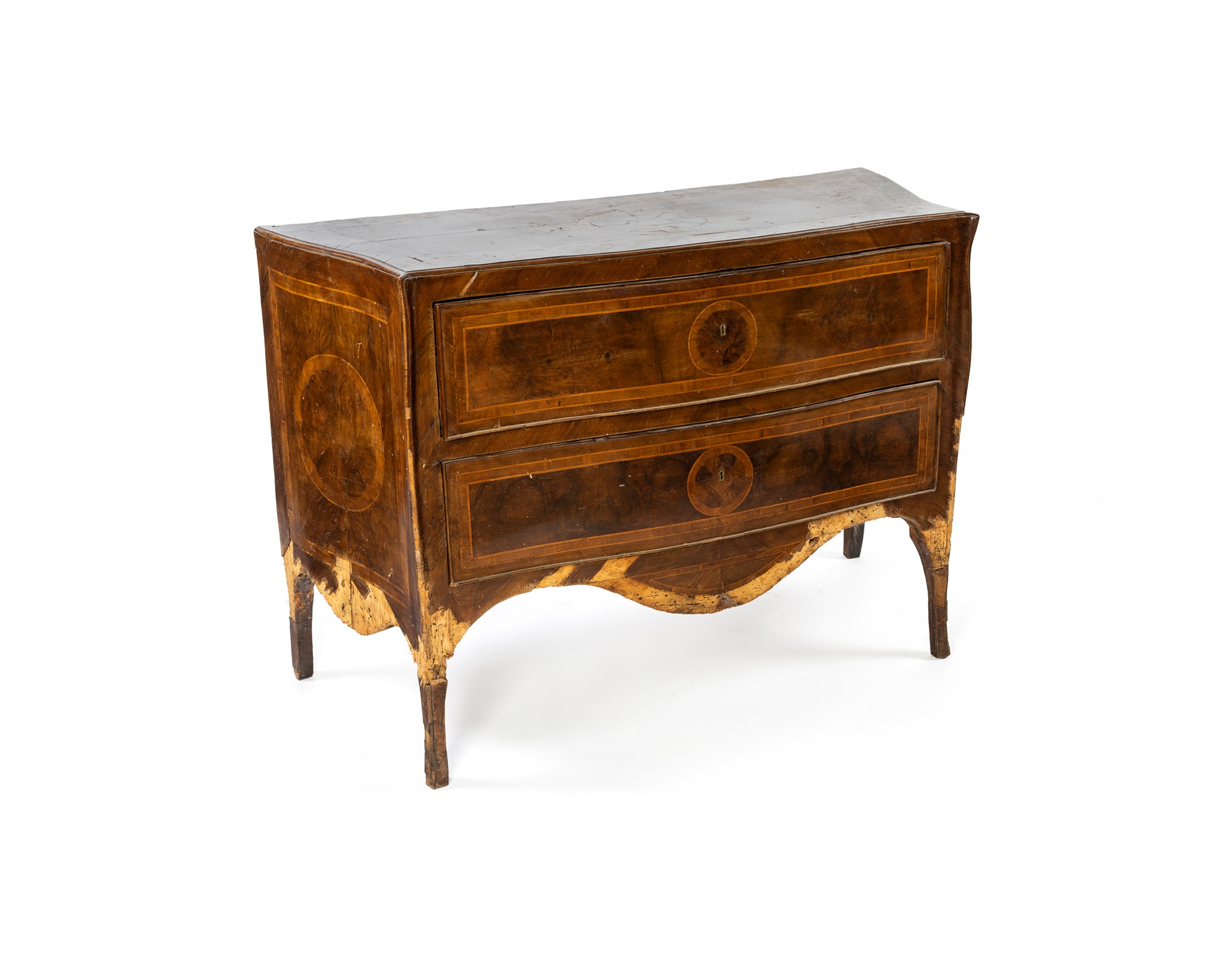 di forma sagomata con filettature intarsiate in legno di frutto; due cassetti frontali, spigoli curvilinei, piedi a sciabola. Napoli XVIII secolo. Difetti. cm 98x143x60