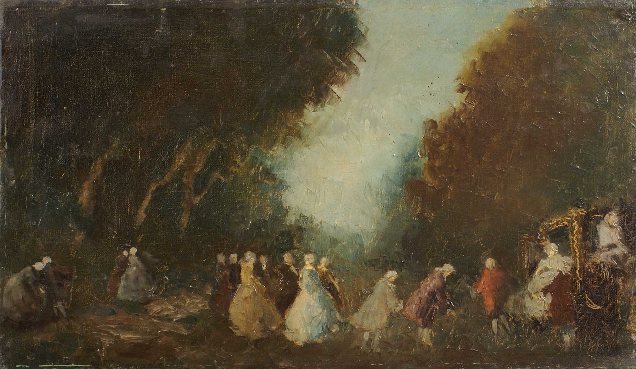 SCUOLA INGLESE XIX Sec. "Carrozza e personaggi in costume con sfondo di paesaggio", bozzetto olio su tela Dim. 31x52 cm.