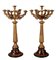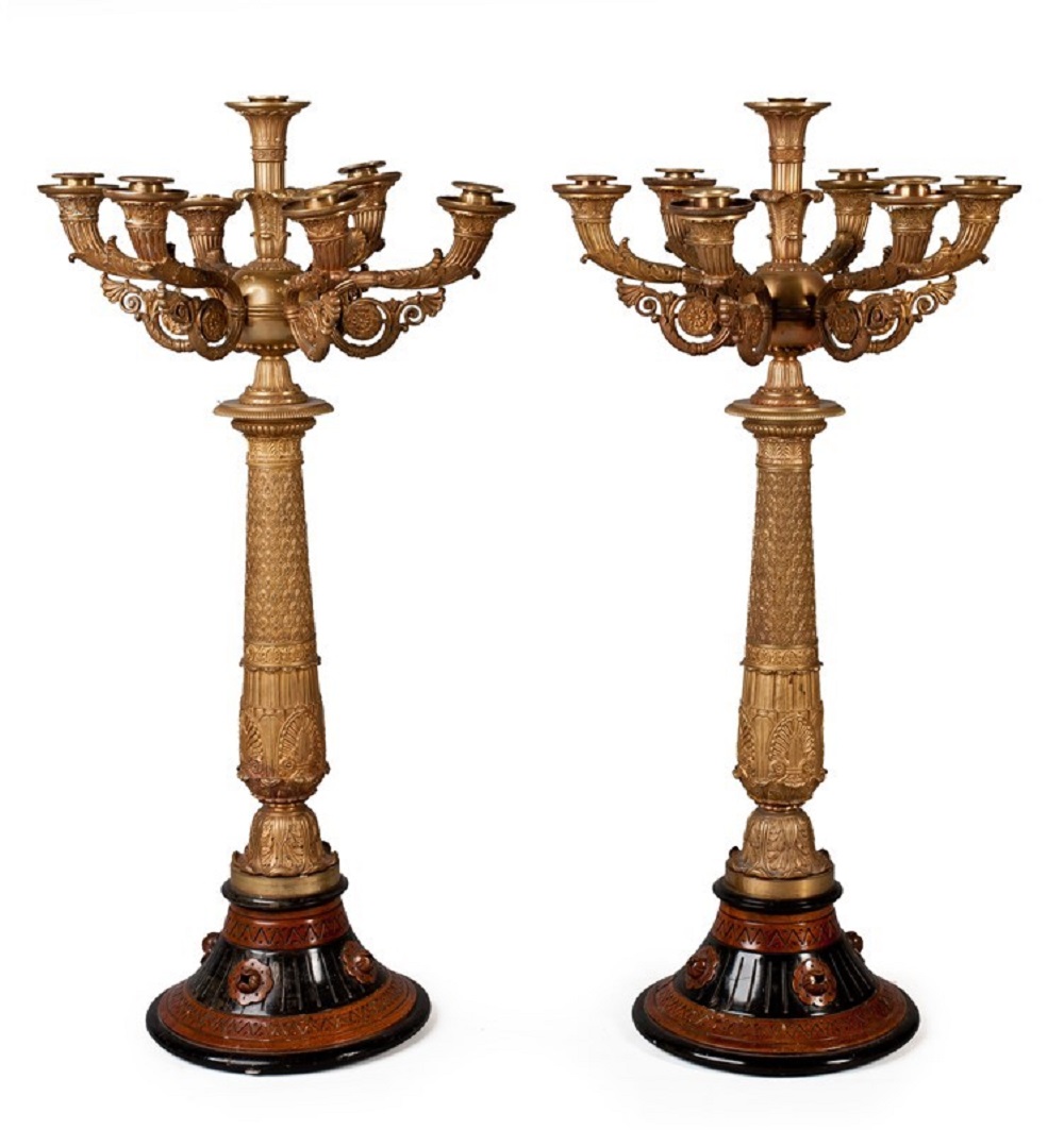 in stile Carlo X, a sette luci disposte sulla sommita di una colonna cesellata a palmette; base circolare in legno naturale e tinto, con decorazione incisa a motivi geometrici e corolle in rilievo. Francia XIX secolo, altezza cm 82