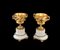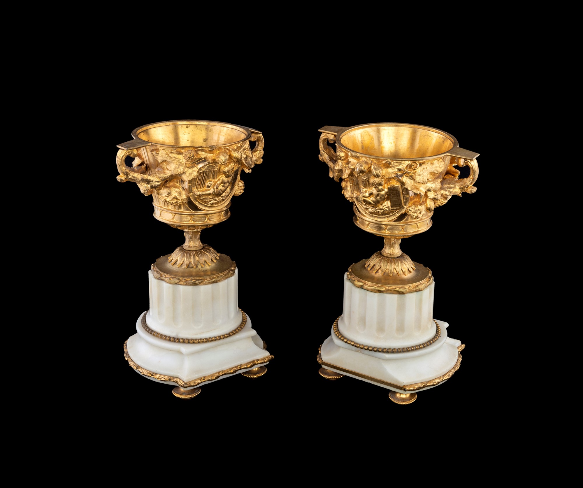 a forma di coppa biansata caratterizzata da figure allegoriche in bassorilievo; piedistallo in marmo bianco a rocchio di colonna. Fine del XIX secolo. altezza cm 24