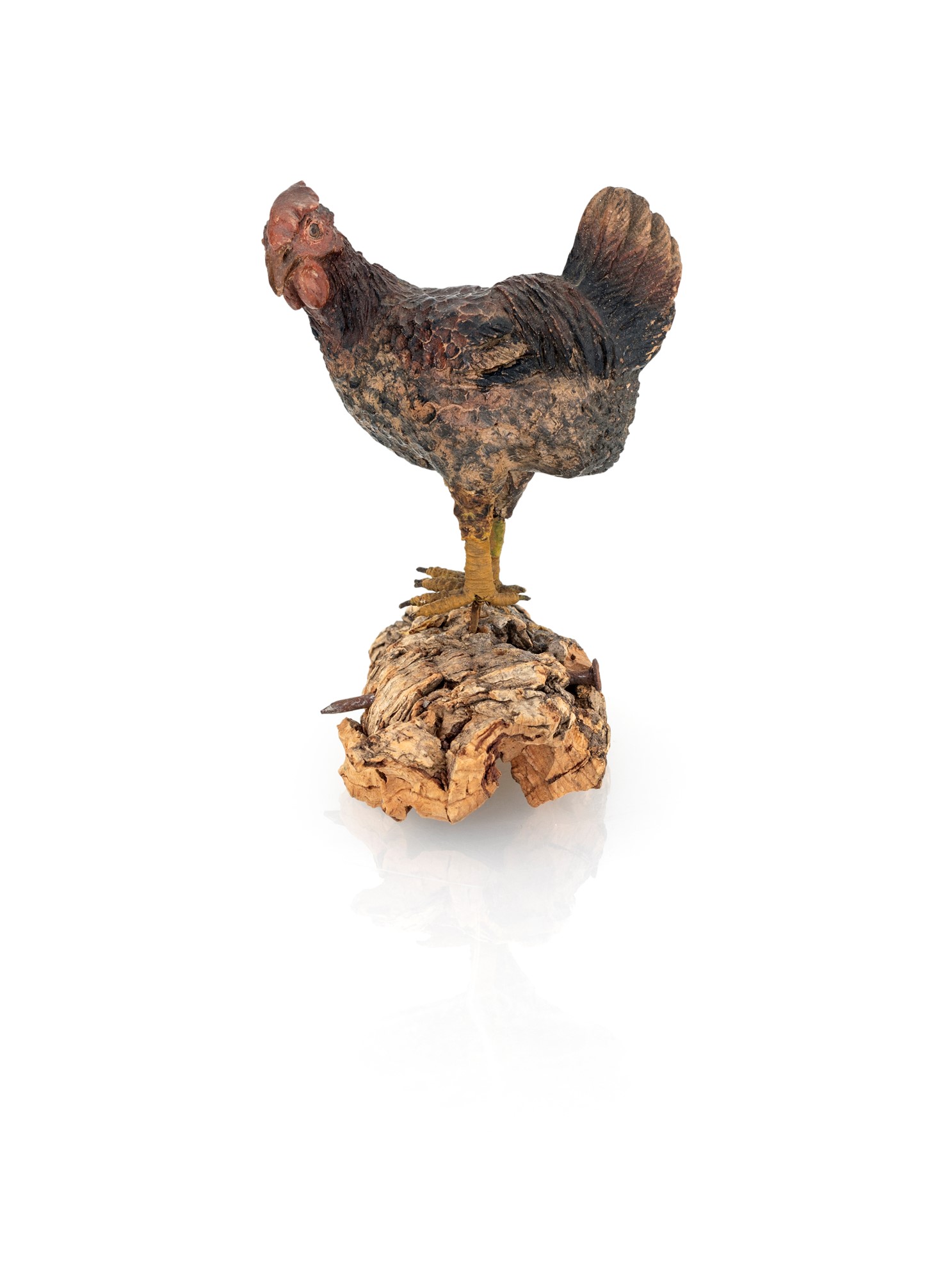 in terracotta policroma, occhi di vetro, girata a sinistra, piume rosse e nere cm 7x9