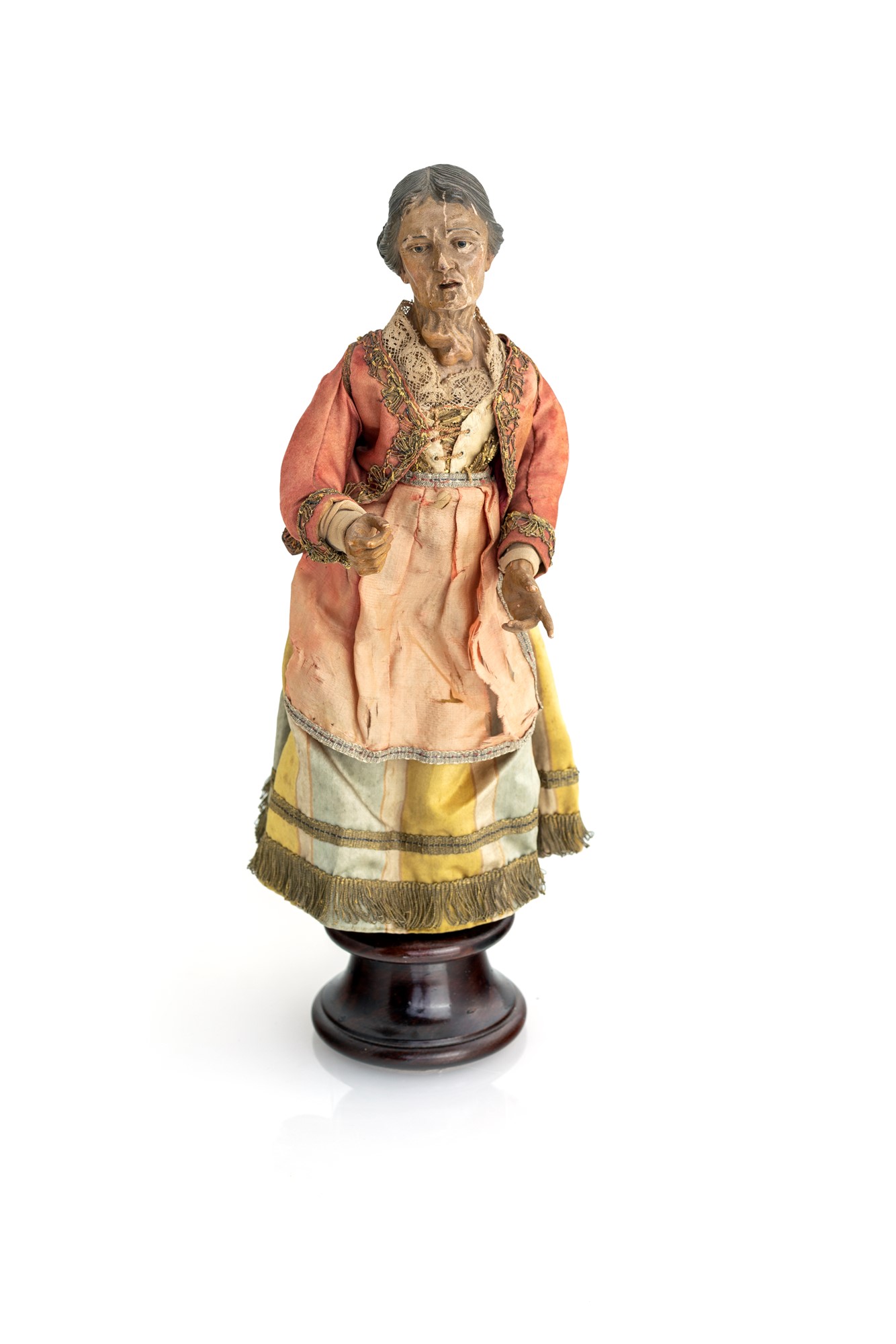 con testa di legno, occhi di vetro, gozzo, camicia plissettata, corsetto beige, giacca rosa con galloni d'oro, ampia gonna verde con ricca frangiatura in basso, grembiule rosa stinto. Difetti sul viso altezza cm 37