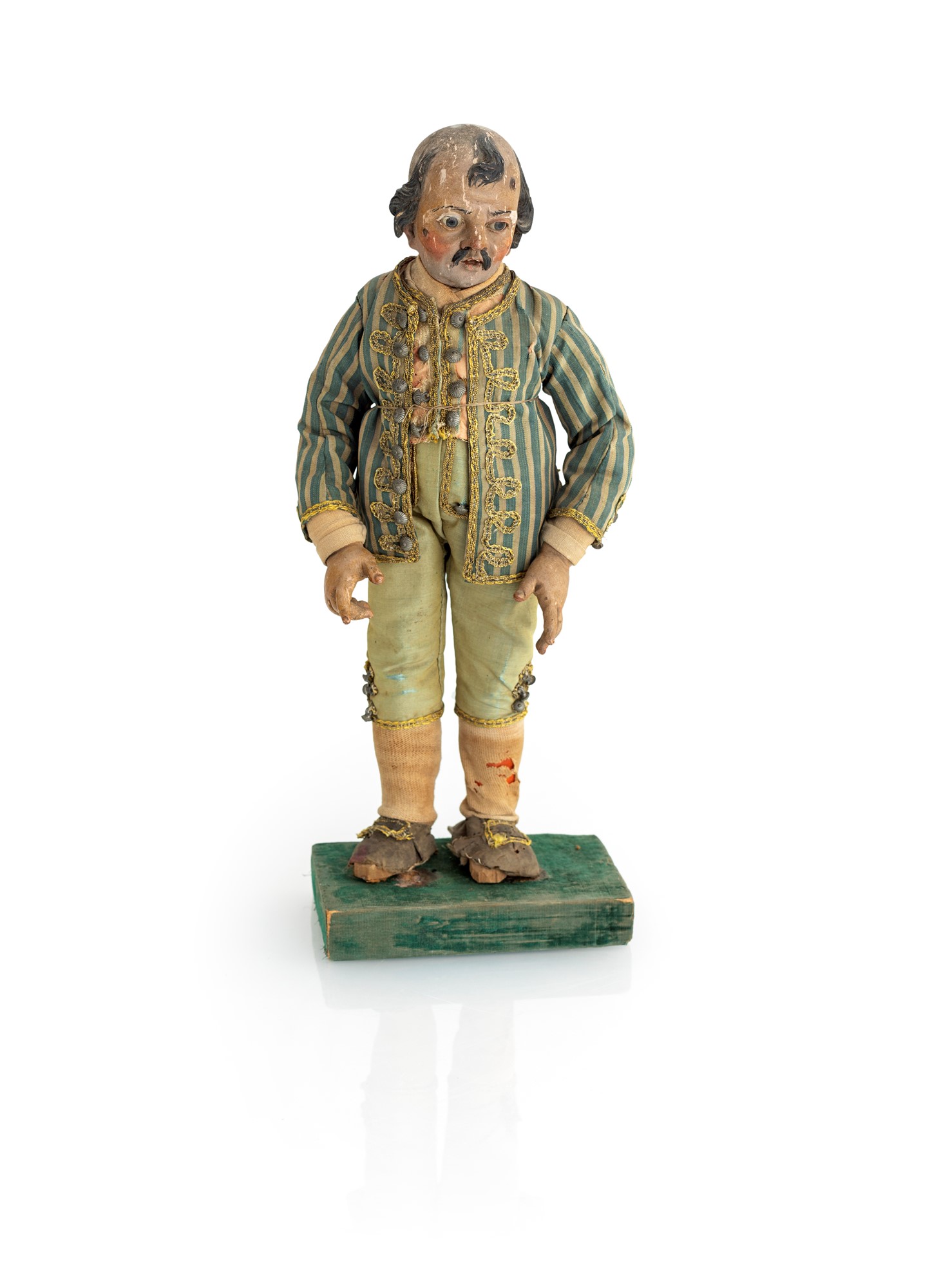 con baffi, testa di legno, occhi di vetro, panciotto con grandi bottoni, giacca di seta a righe, pantaloni di seta verde, calzettoni. Difetti al piede sinistro e alla suola del piede destro altezza cm