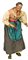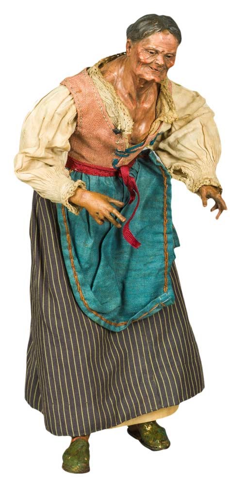 camicia bianca, corpetto rosa, gonna scura a righe fissata con fiocco rosso, grembiule turchese con gallonatura dorata, pantofole ai piedi altezza cm 28