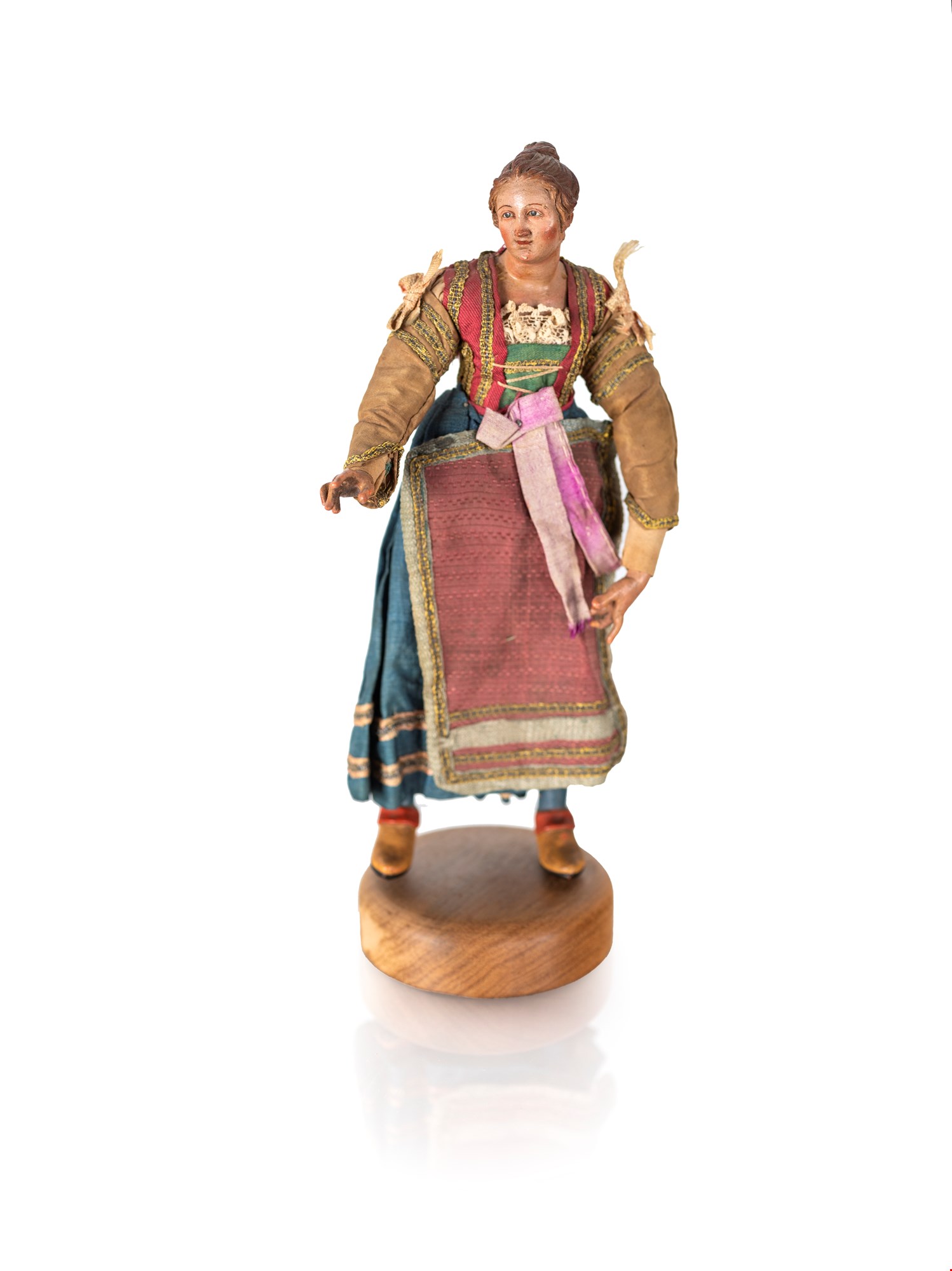 attribuita a Nicola Somma (sec. XVIII). Camicia bianca merlettata, corpetto in velluto verde, giacchetta rossa con gallonature, maniche beige unite alla giacchetta da nastri, gonna turchese, ampio sinale rosa con grande fiocco, scarpette con fibbia. altezza cm 23