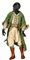 panciotto beige, grandi bottoni, giacca verde con gallonature dorate, camicia beige, pantaloni beige, cappotto in seta verde con gallonature, stivali ai piedi altezza cm 39