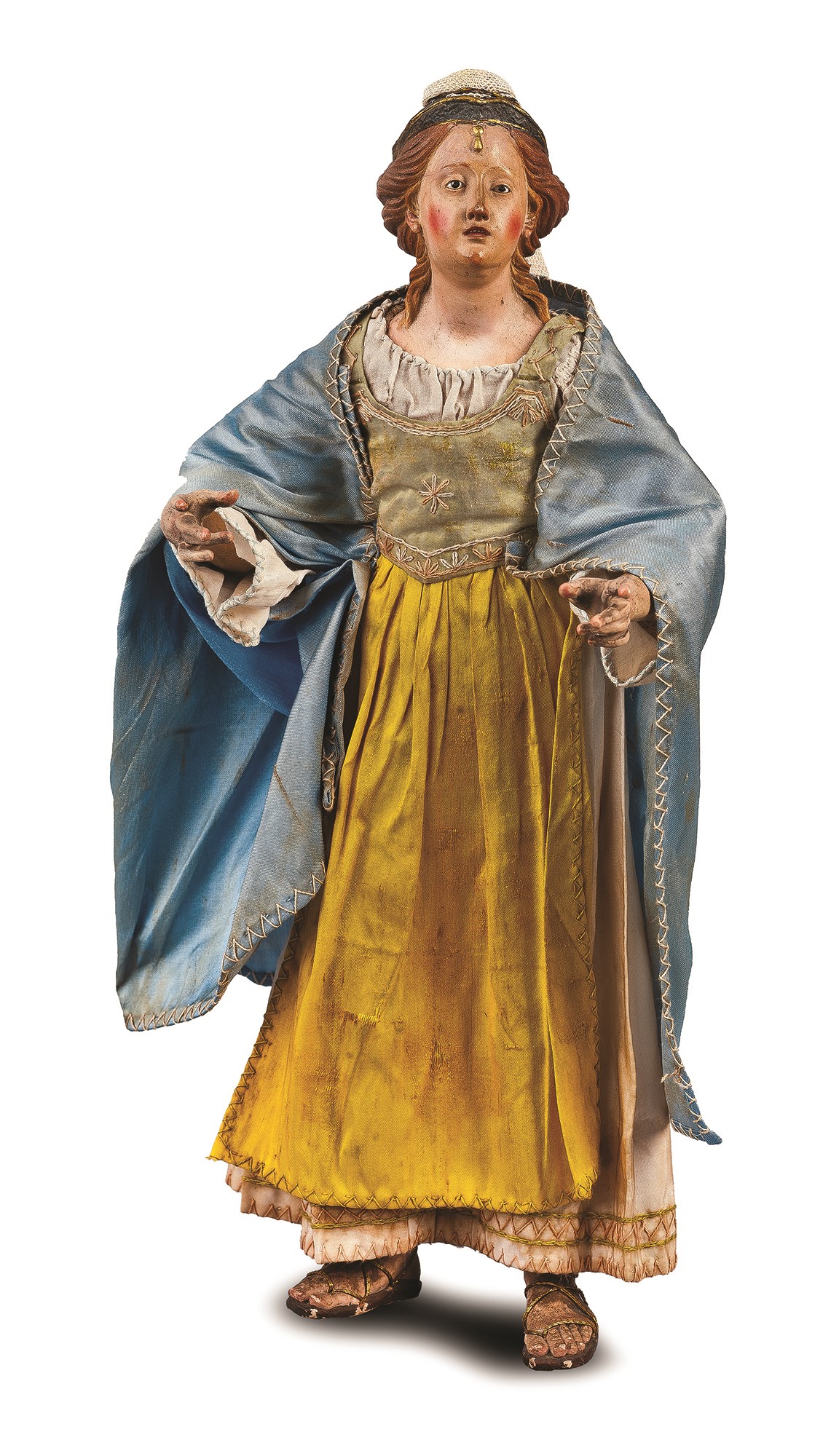 diadema e pendaglio sulla fronte, tunica bianca plissettata, corpetto in seta verde, mantello in seta azzurra, sandali ai piedi altezza cm 30