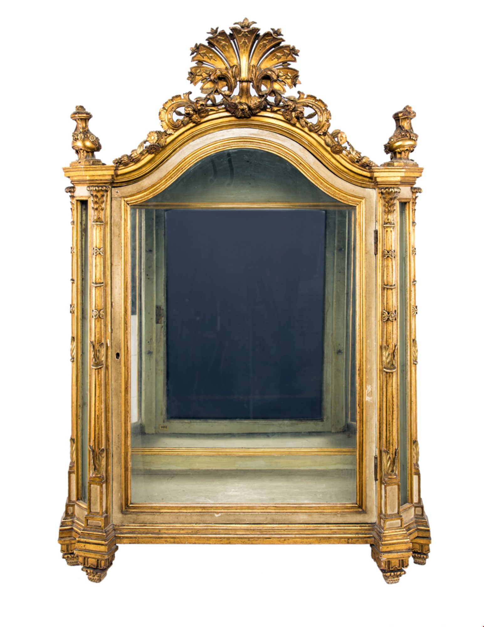 in legno policromo, scolpita e dorata, Luigi XVI, con ampia cimasa intagliata a motivi vegetali. misure interne: cm 75x66x29 - misure esterne: cm 98x79x40