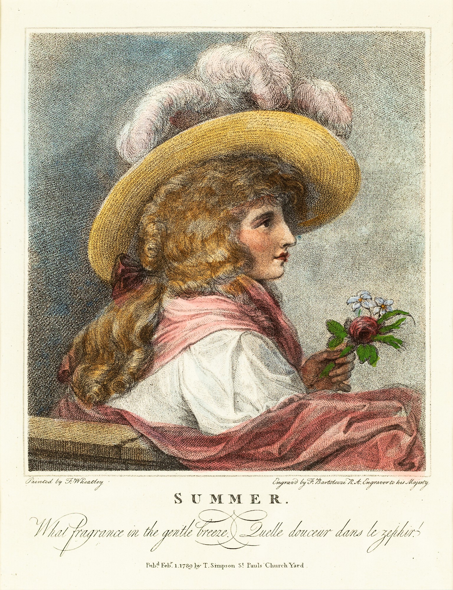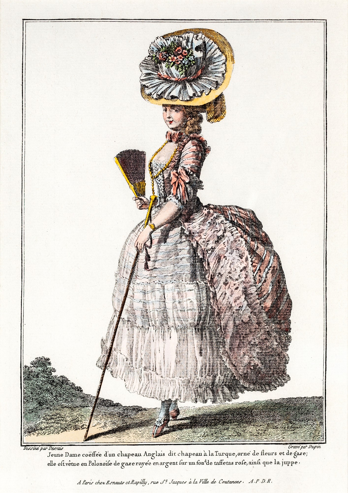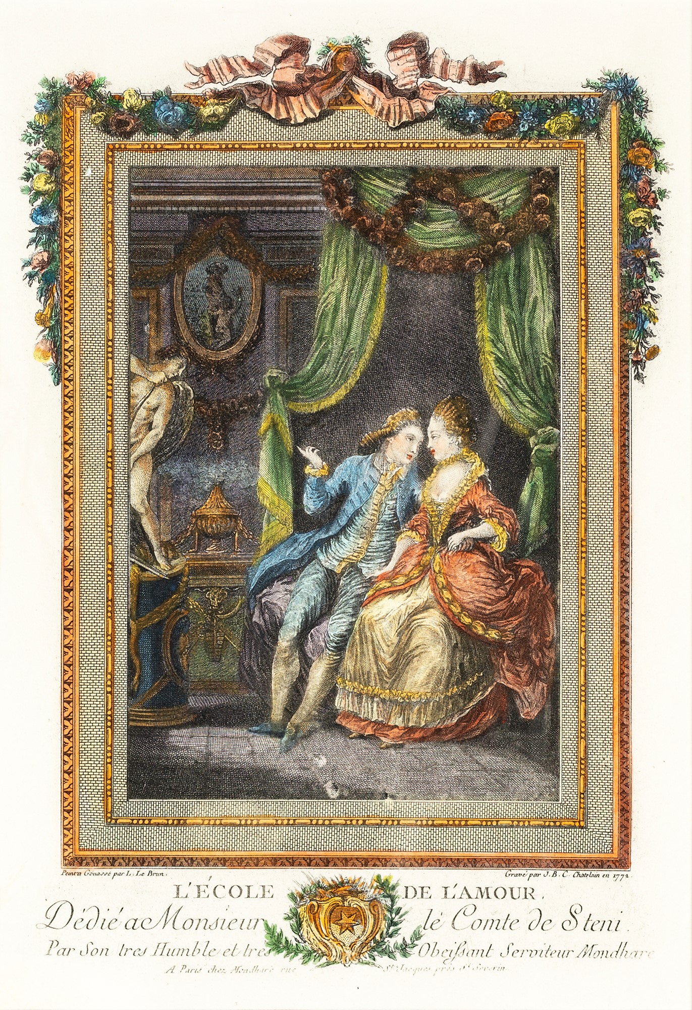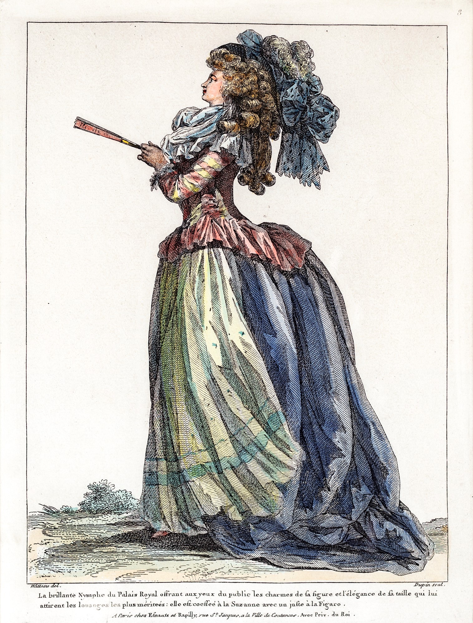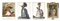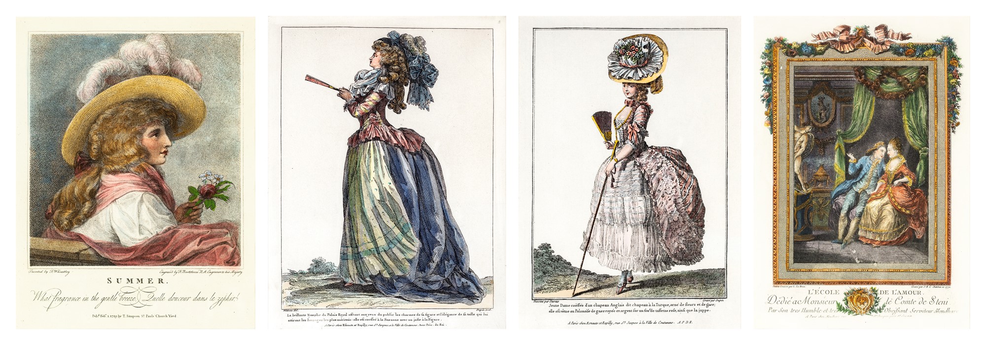 Four colored prints depicting gentlewomen and gallant scene