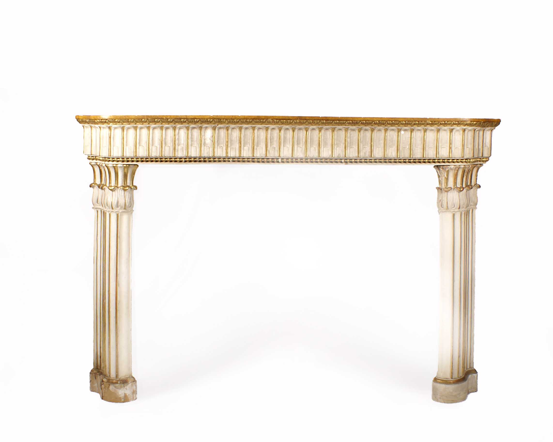 CAMINO IN LEGNO LACCATO AVORIO E DORATO Venezia fine del XIX Sec. Piano sagomato e laccato a simulare il marmo giallo di Siena, parte frontale e sostegni intagliati a motivi di colonne e capitelli, (difetti e mancanze) Dim. 127x177x21 cm.