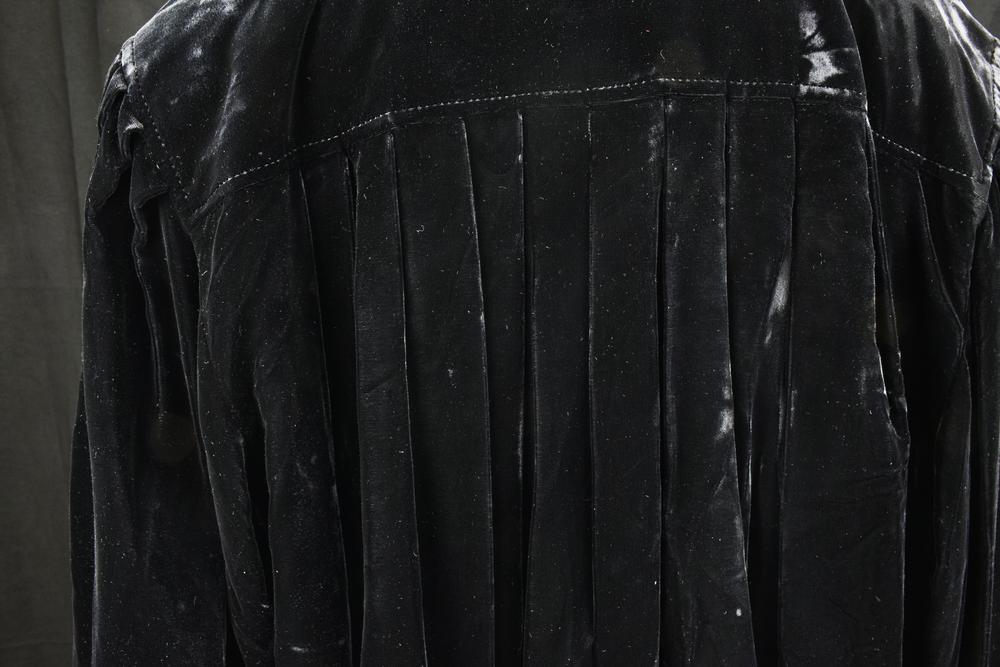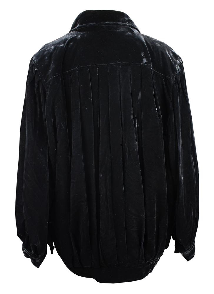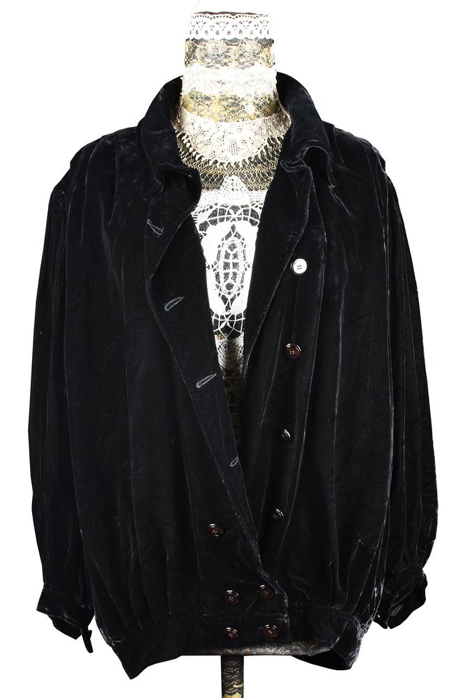 Ampia giacca in velluto di seta nera di linea femminile, lunghezza a vita chiusa con bordo
