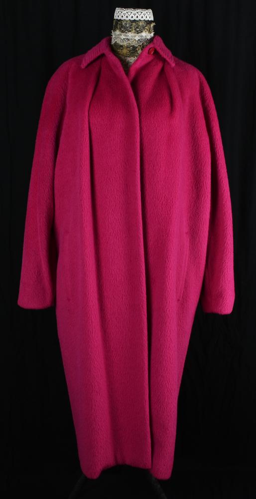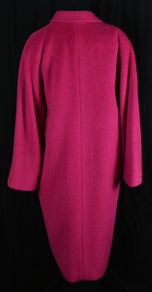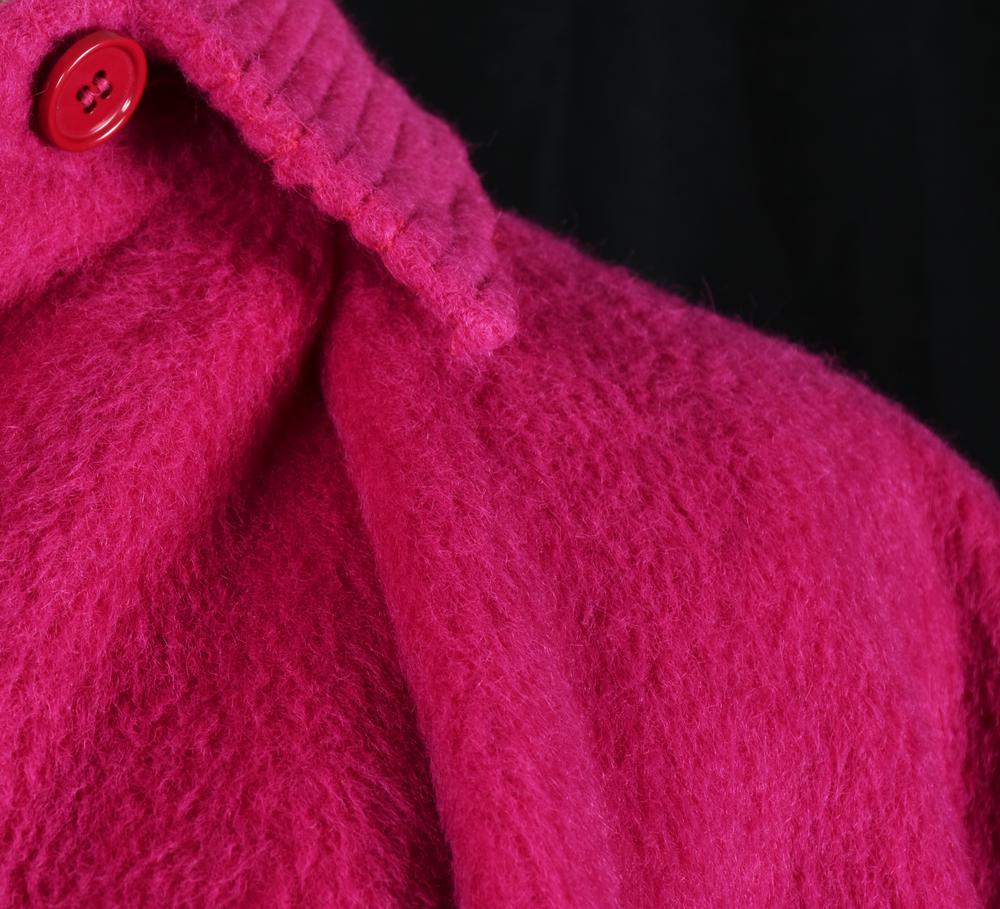 Cappotto di color fucsia in alpaca e lana del Perù modello in stile Grace Kelly. Manica raglan, lungo al polpaccio, piccolo colletto