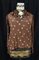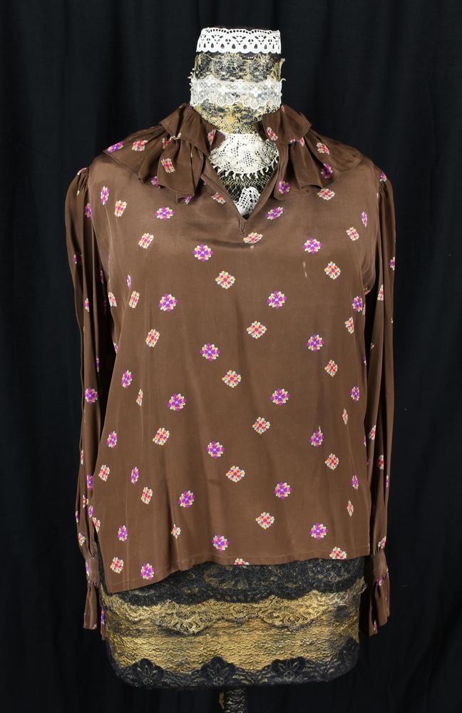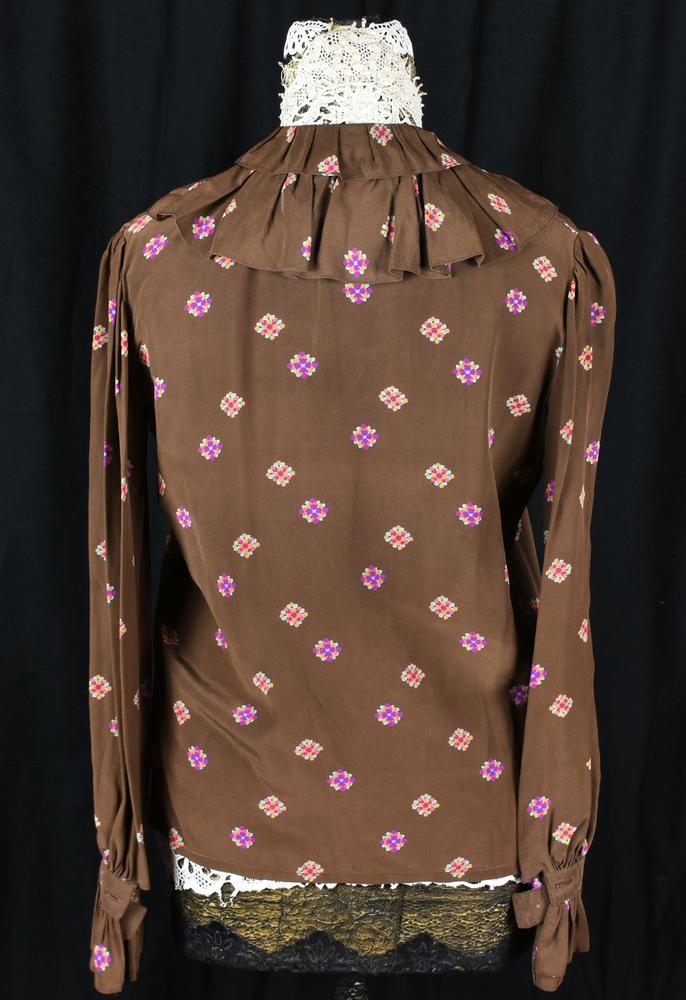 Camicetta in seta color marrone con piccole stampe di fiori colorati arricchita di piccola rouches intorno al collo e ai polsini