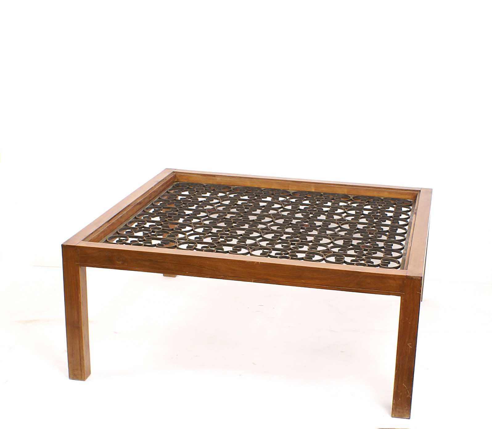 TAVOLINO BASSO vecchia manifattura In noce tanganica, piano quadrato in ferro battuto e rivestito in vetro Dim. 47x112x112 cm.