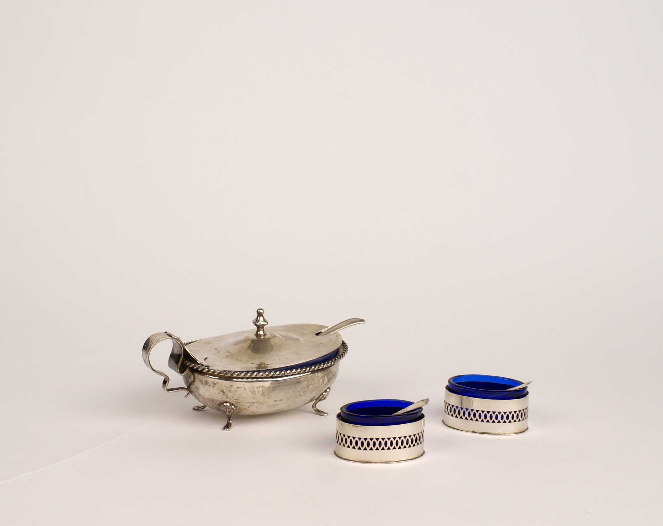 LOTTO IN ARGENTO manifattura italiana Composto da una formaggiera e da una coppia di salierine con interno in opalina blu Peso 320 gr.