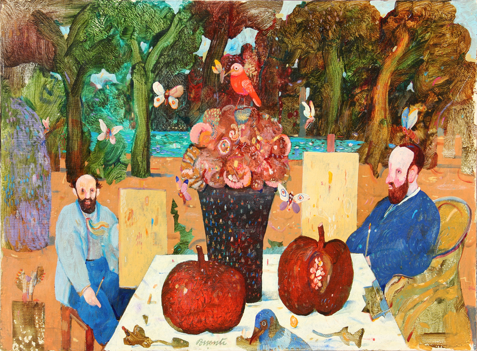 Due pittori in giardino 1989 olio su cartone telato cm. 50 x 70