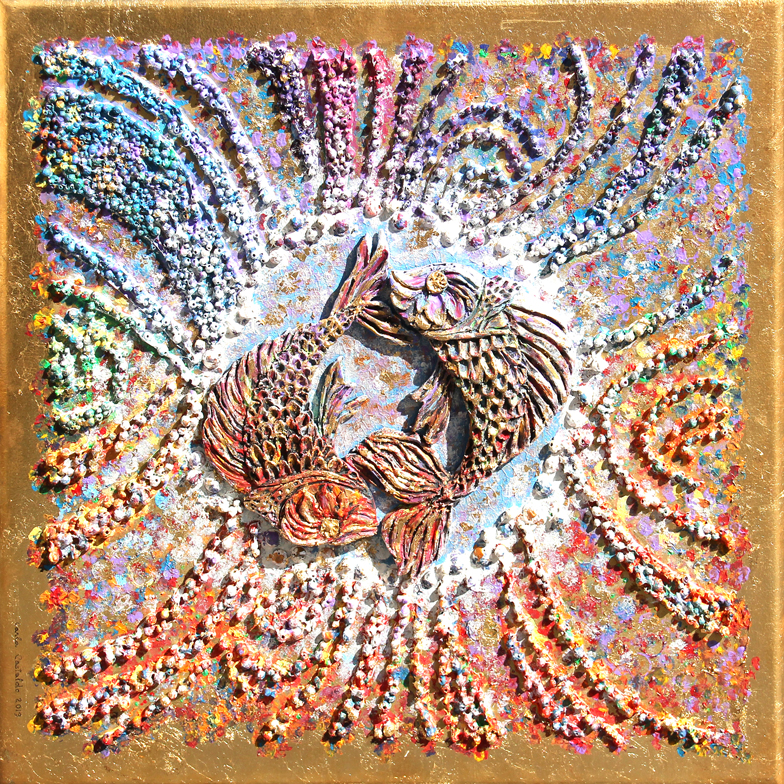 Il suono della quena 2019 terracotta, acrilico e foglia d'oro su tavola cm. 46 x 46