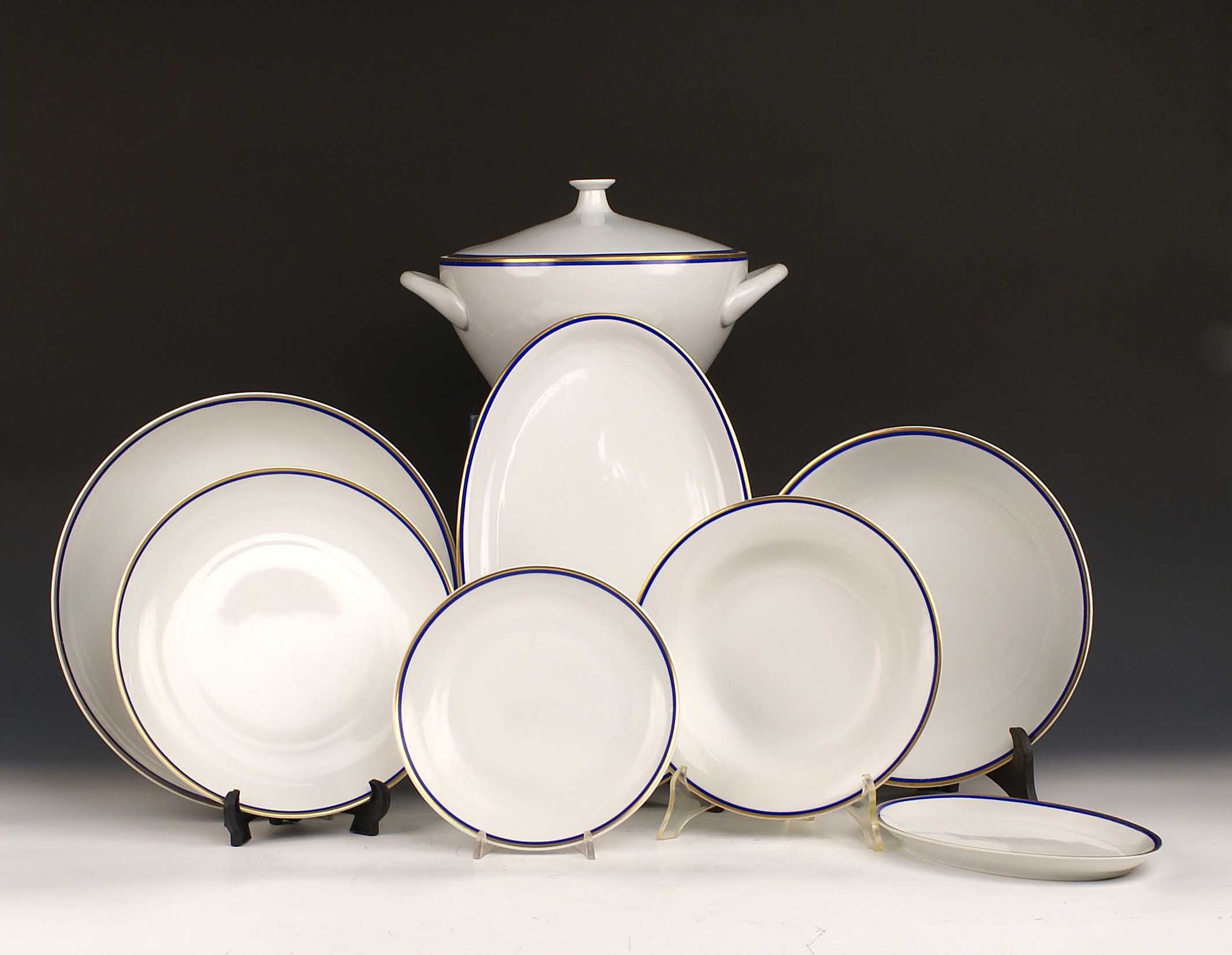 SERVIZIO DI 53 PIATTI IN PORCELLANA Bohemia vecchia manifattura Profilato in oro e blu cobalto, composto da 24 piatti piani, 12 piatti fondi, 12 piattini frutta, 1 zuppiera, 1 raviera e 3 piatti da portata
