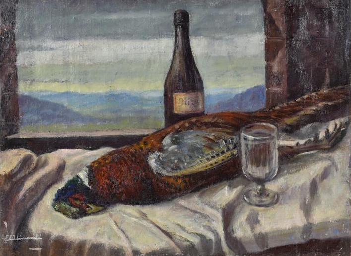 Enrico Allimandi SELVAGGINA olio su tela, cm 42x50 sul fronte: firma eseguito...