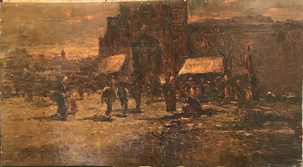 Ferruccio Rontini GIORNO DI FIERA MUGELLO olio su compensato, cm 48,5x87,5...