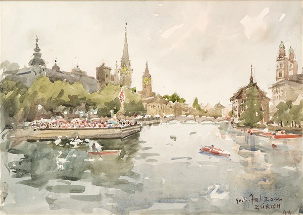 Giulio Falzoni "Zurigo" '49 acquerello su carta applicata a tela (cm 36x50) Firm
